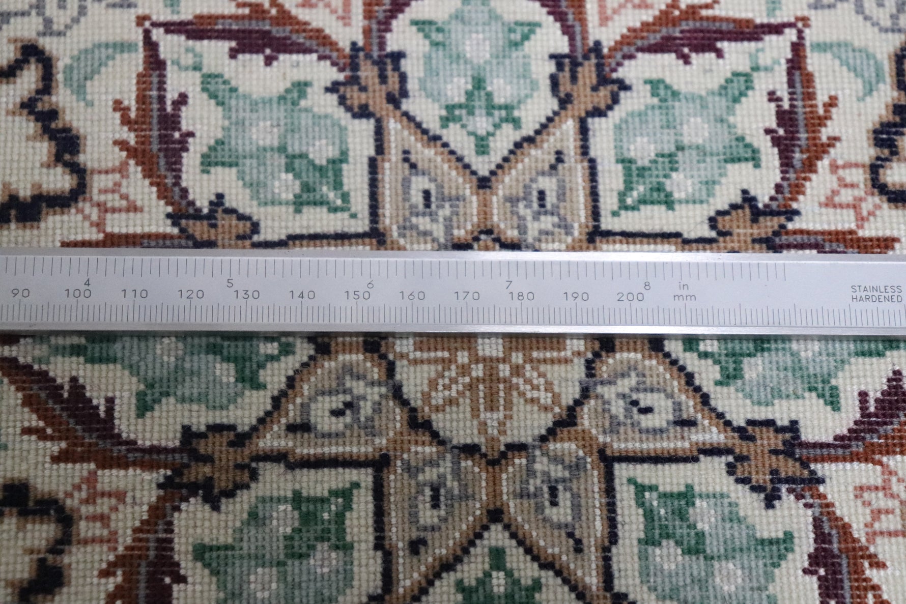 ペルシャ絨毯の真価は、実は裏側裏側からこそわかる!最高級のペルシャ絨毯は、1cmあたり10ノット(織り目)の精緻な結びが施され、その細やかさが芸術の域に達しています。