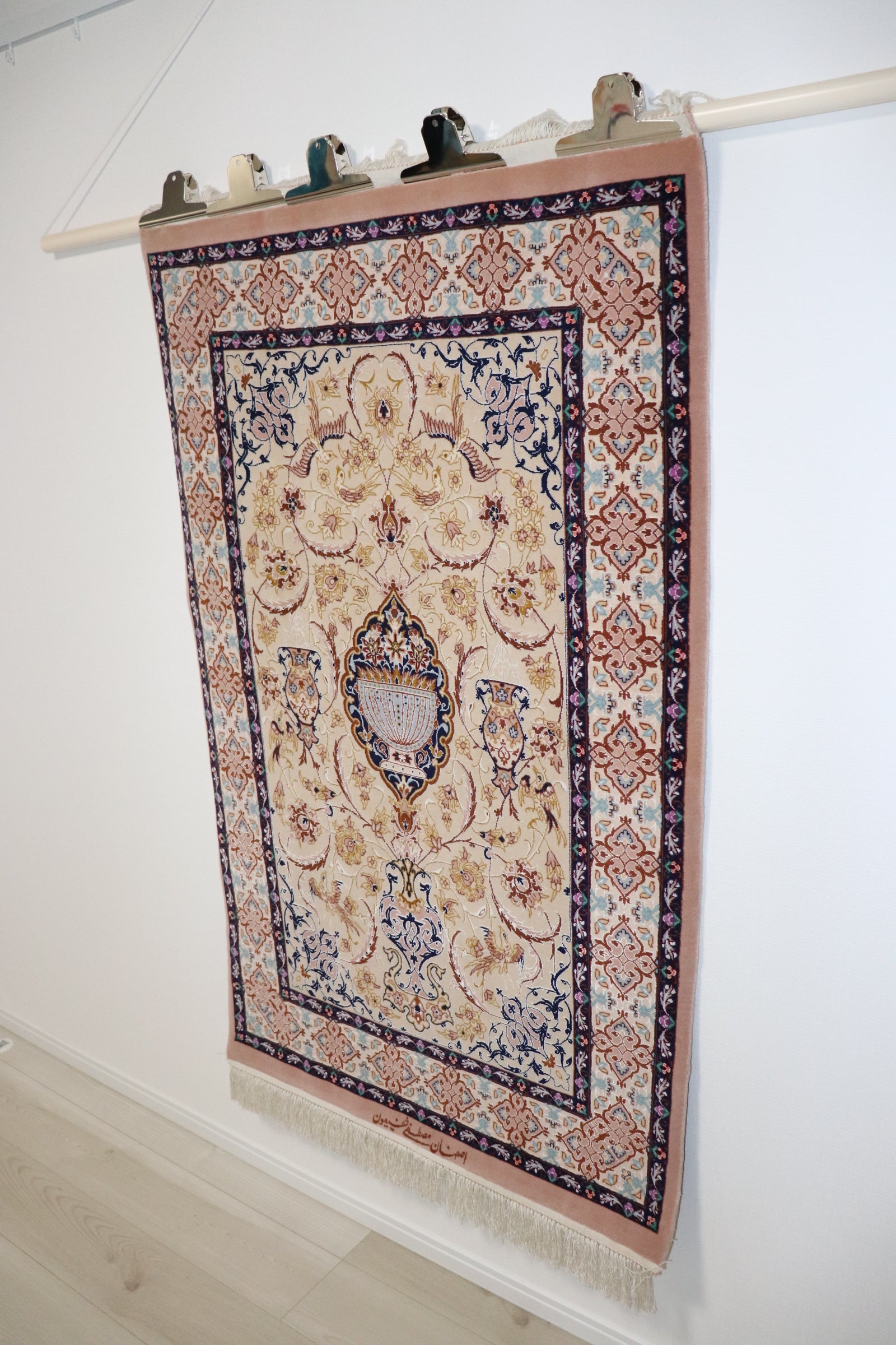 モスタファシャフィユン工房が手掛けたこちらのペルシャ絨毯は、イスファハーンの伝統技術と上品なデザインが融合した逸品です。絨毯全体を彩るのは、柔らかなベージュのフィールドカラーと、エレガントなピンクベージュのボーダーカラーです。この色彩の組み合わせは、空間に穏やかで落ち着いた雰囲気をもたらします。