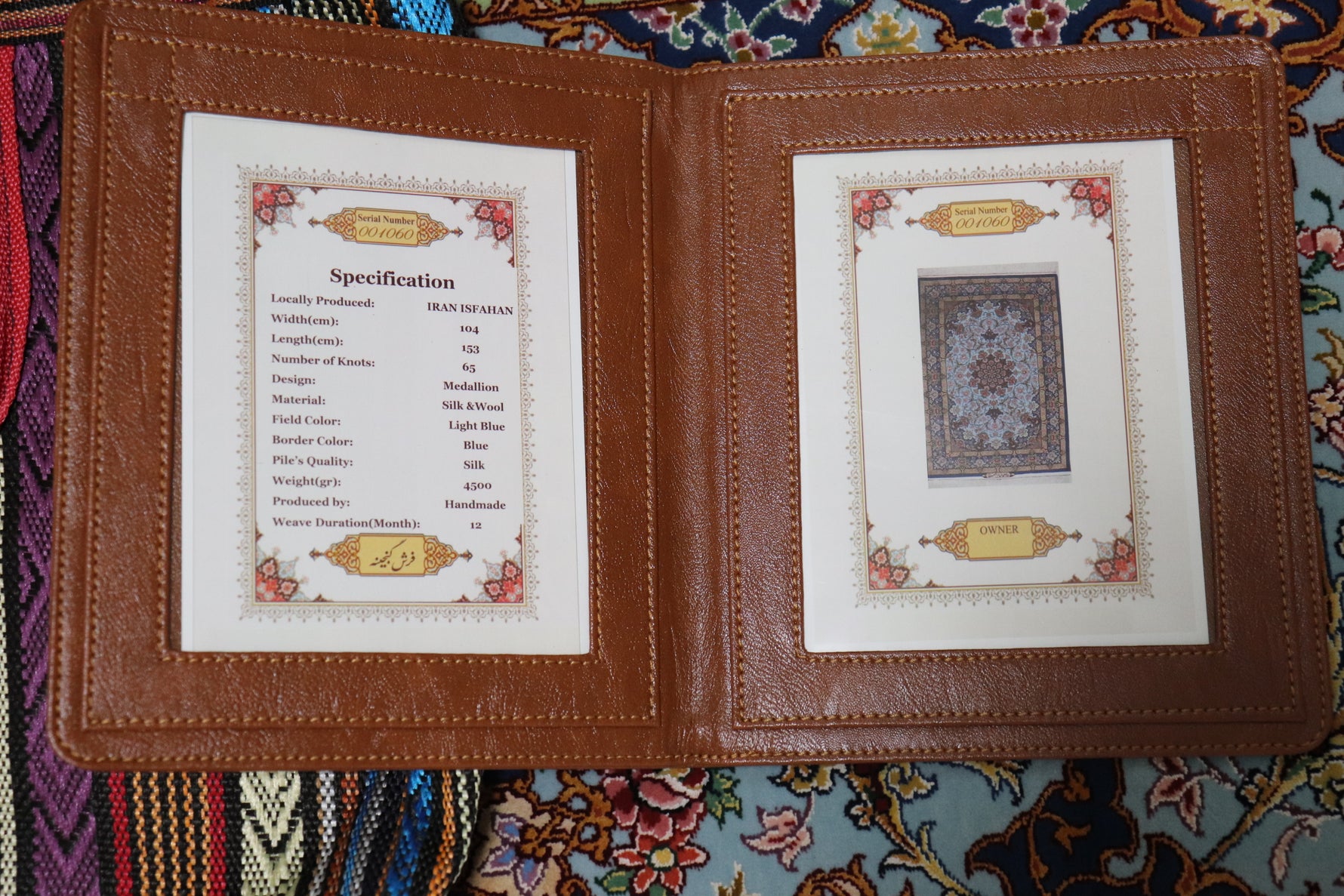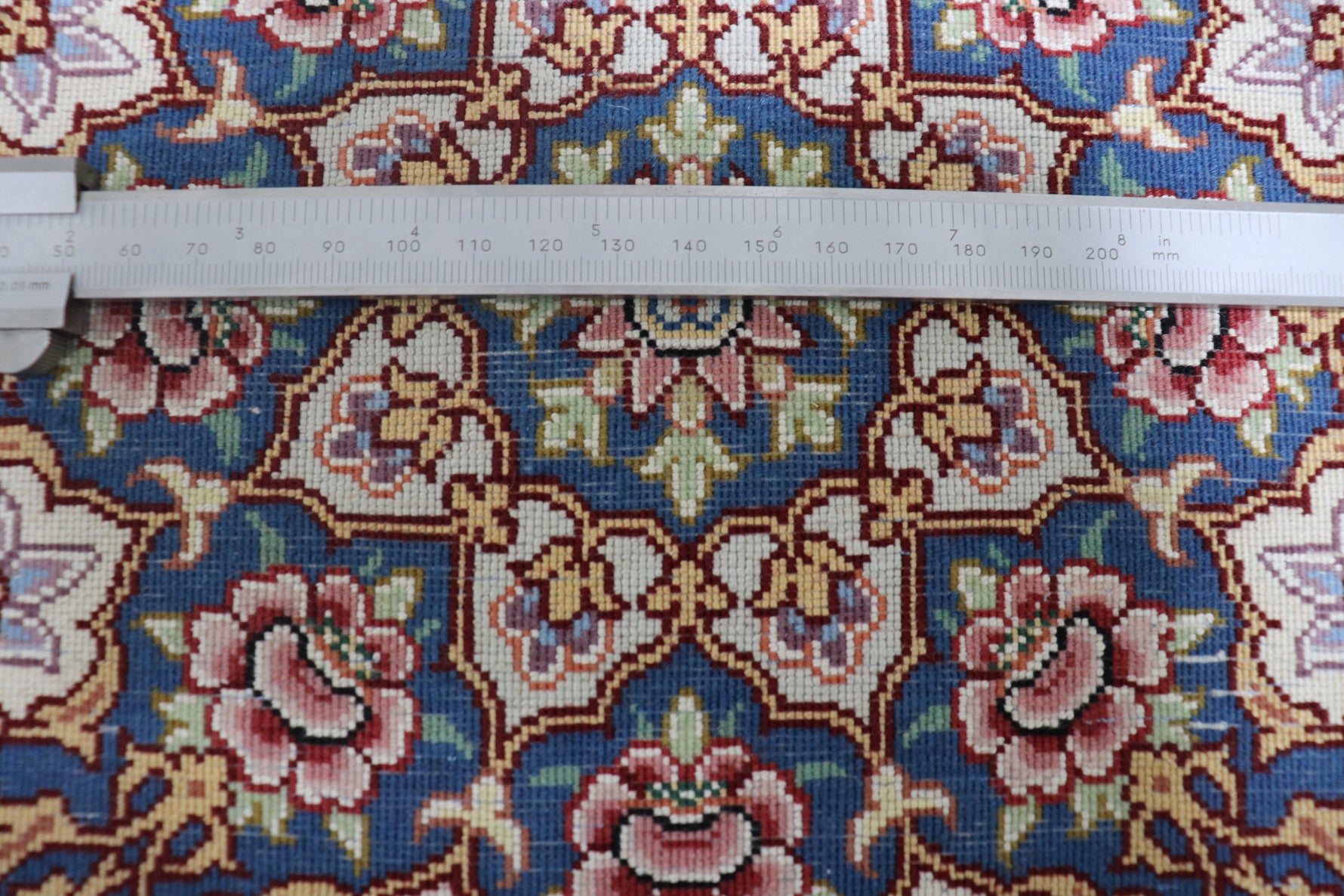 こちらの絨毯の織り密度は90万ノット平方メートル、打ち込み総ノット数は127万ノットという高密度であり、繊細なディテールが丁寧に表現されています。軽やかな光沢を持つシルク素材と、耐久性に優れたコルクウールの組み合わせにより、機能性と美しさを兼ね備えた一枚に仕上がっています。