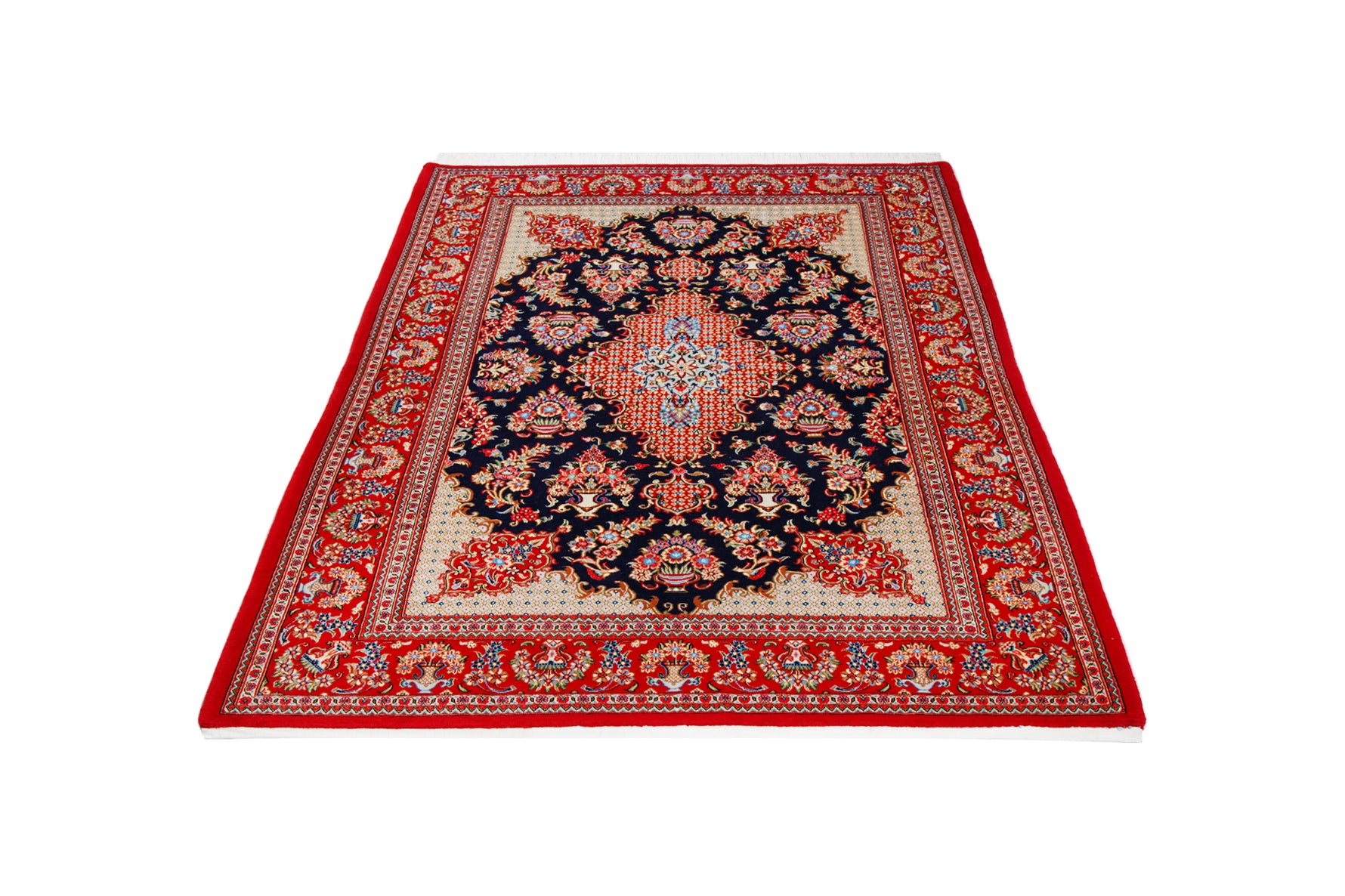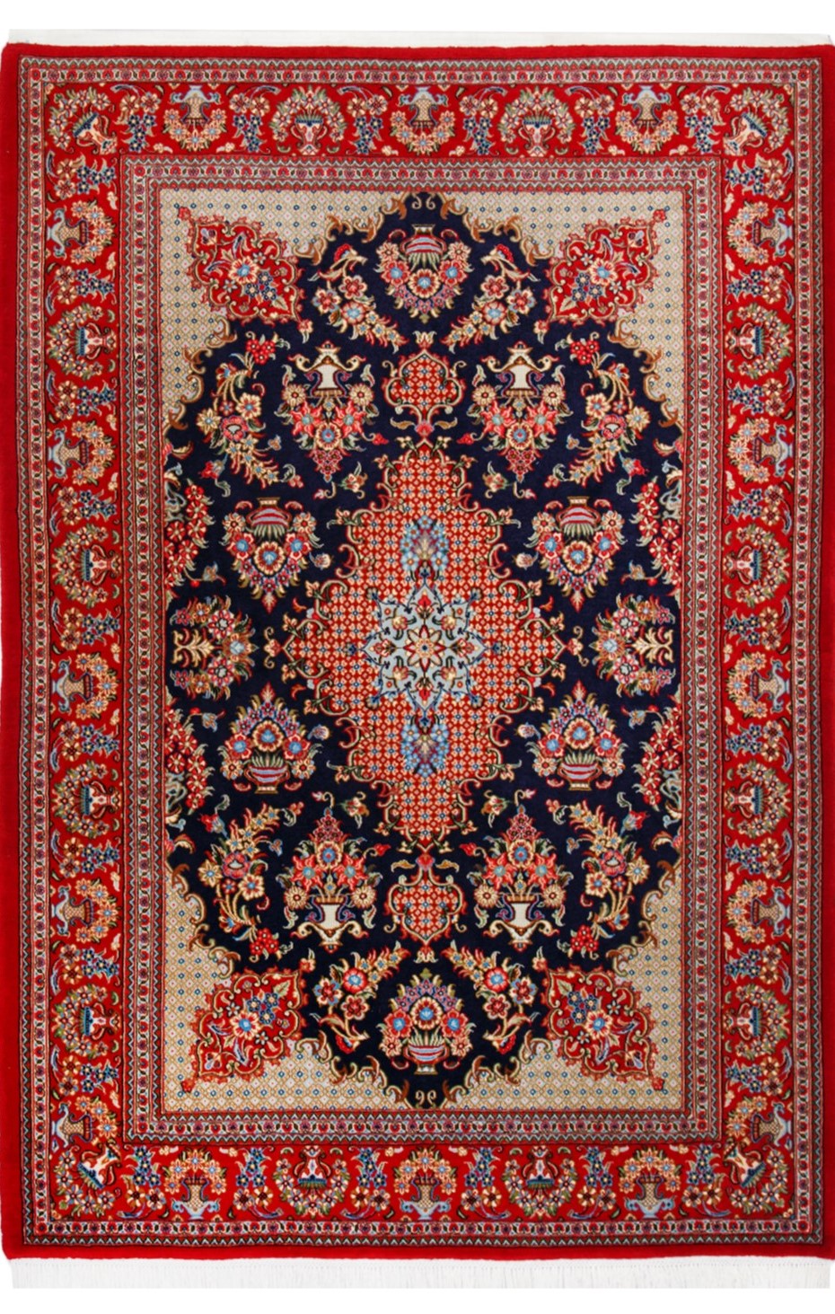 本ペルシャ絨毯は、深みのある紺色を基調としたフィールドに、鮮やかな赤を大胆に組み合わせた華やかなデザインが特徴です。