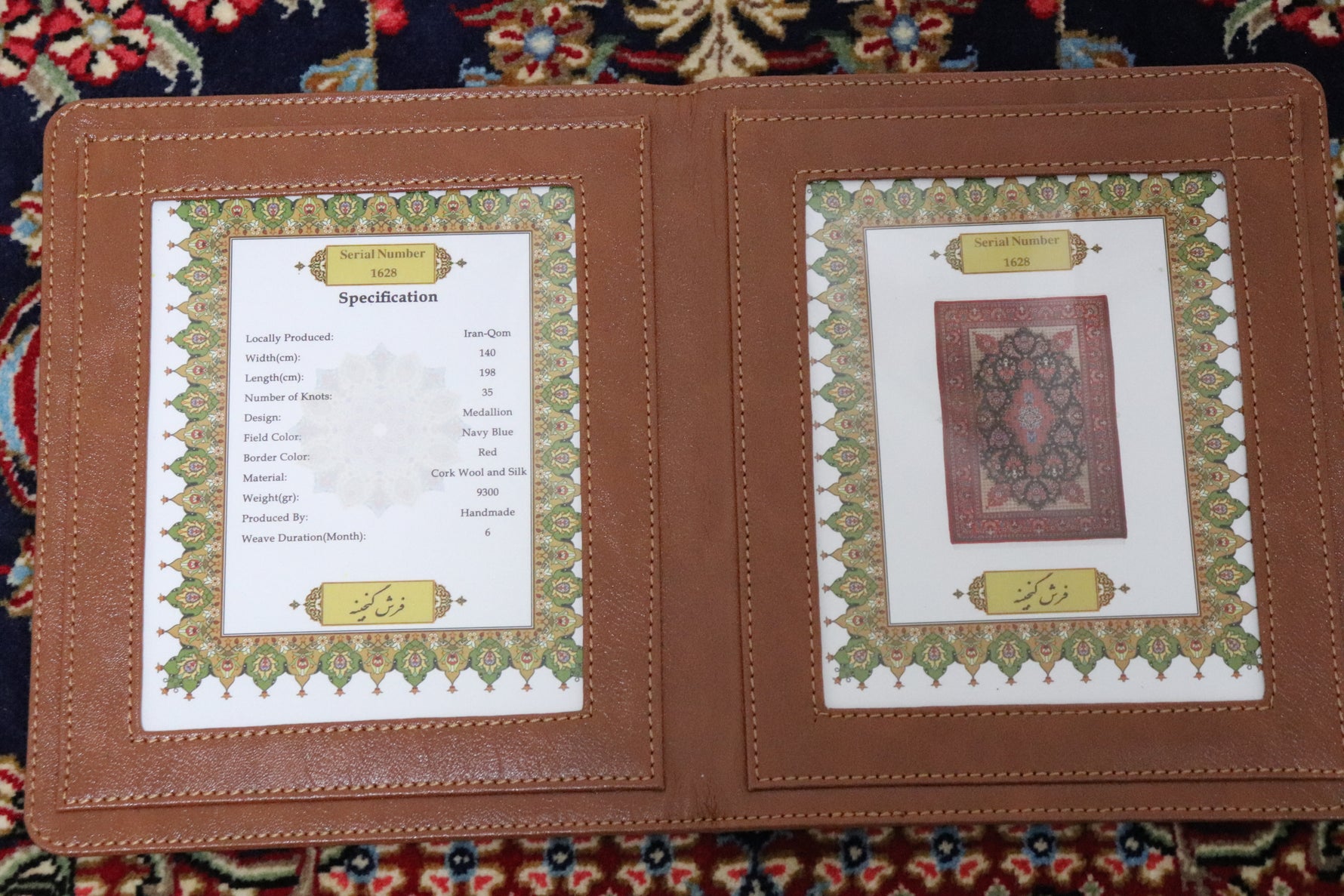 ペルシャ絨毯 クム産 コルク&シルク赤×黒の色合い 玄関マット、リビングスペースサイズ ID18036