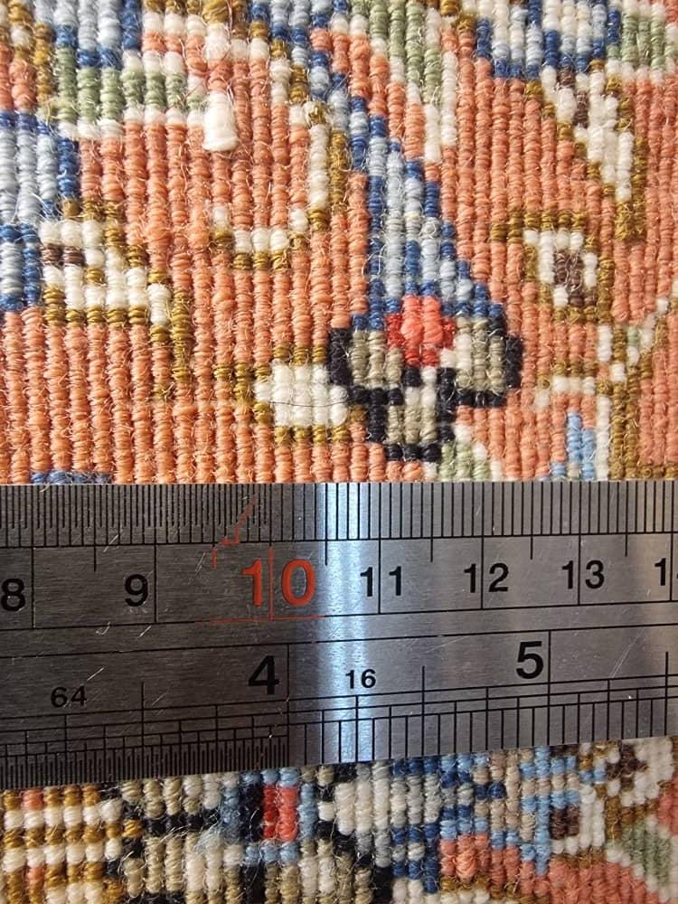ペルシャ絨毯の真価は、実は裏側裏側からこそわかる!最高級のペルシャ絨毯は、1cmあたり10ノット(織り目)の精緻な結びが施され、その細やかさが芸術の域に達しています。