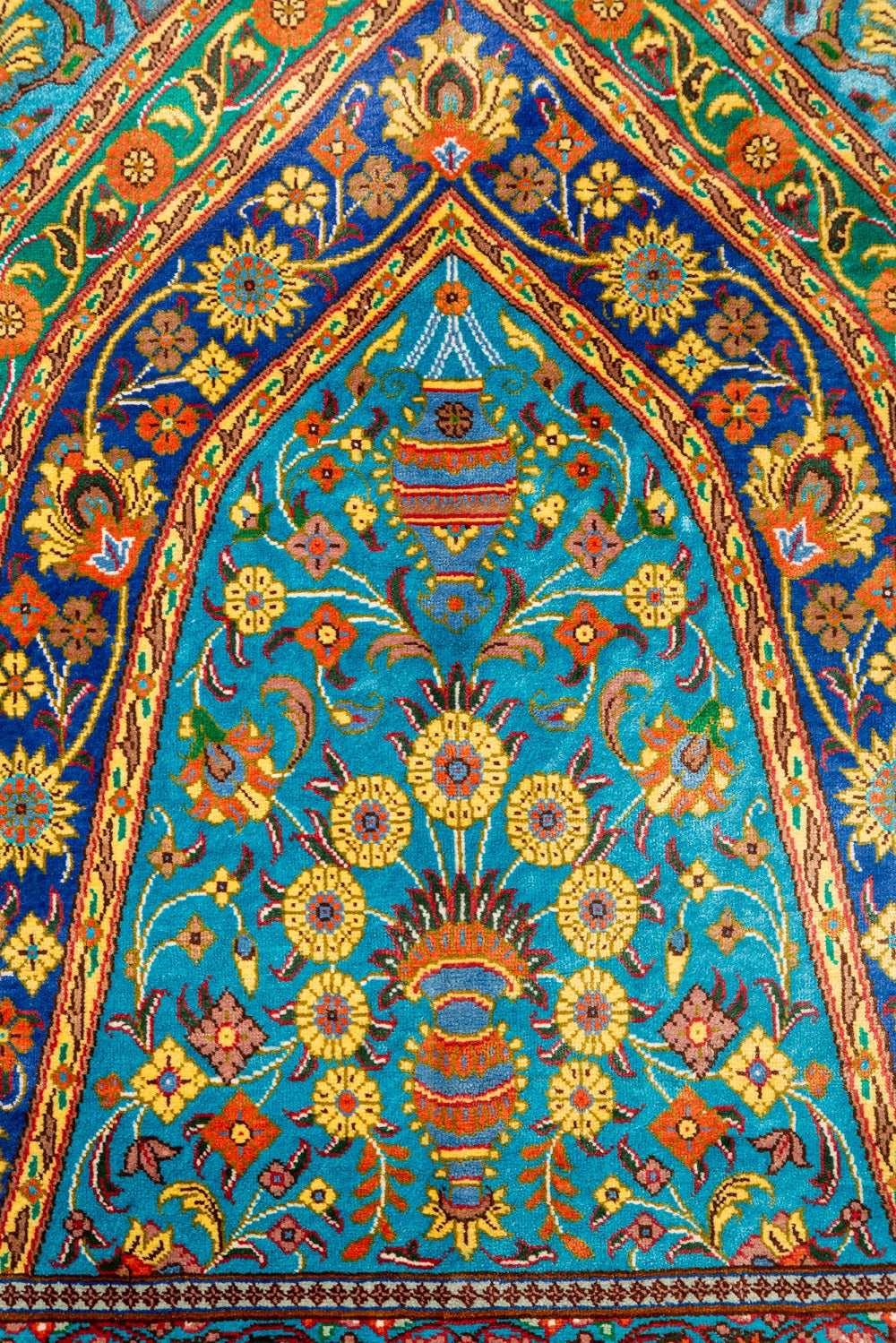 アルバル工房の絨毯は、最高級シルクを使用し、天然染料を活かした染色技術で色鮮やかに仕上げられます。織りの密度は1平方メートルあたり100万~120万ノットと極めて緻密で、熟練の職人が長年の修行を経て制作しています。滑らかでしなやかな質感と、細部まで精密な仕上がりが特徴で、美術品レベルの完成度を誇ります。