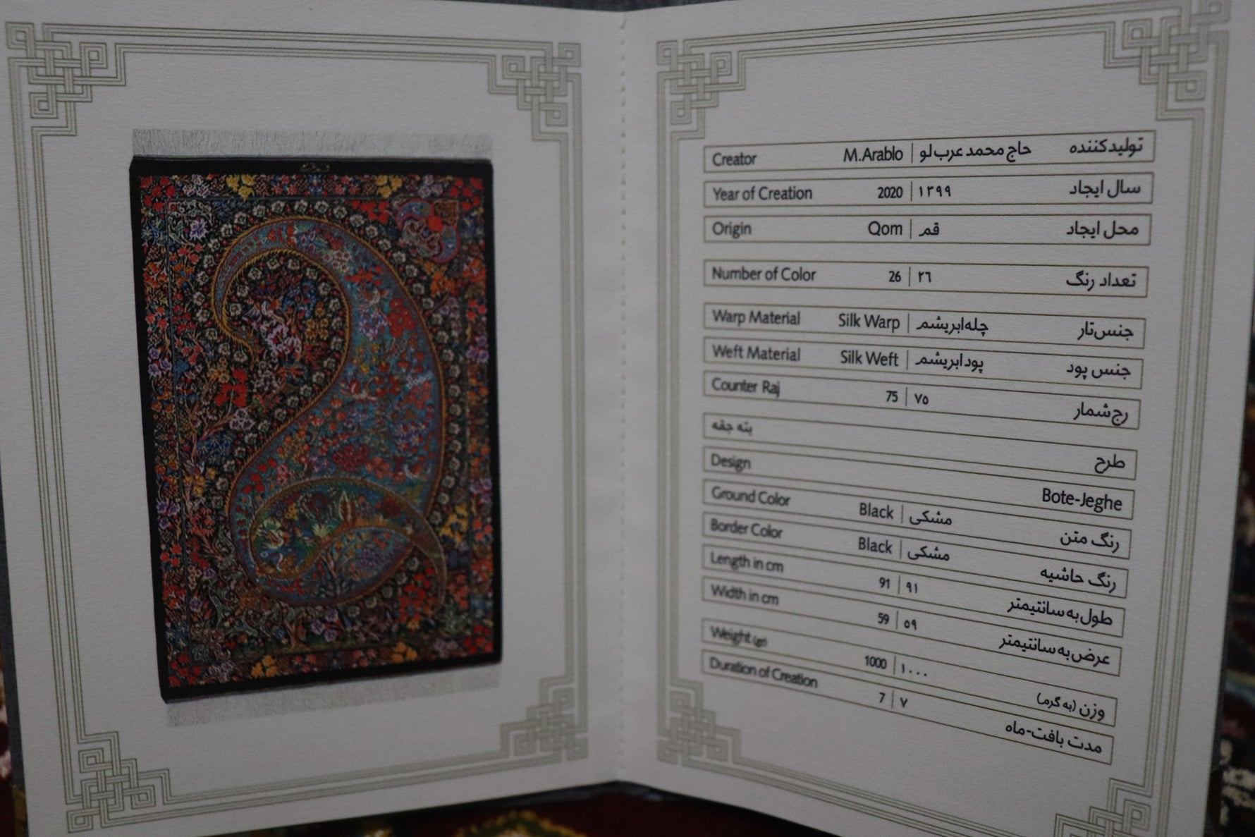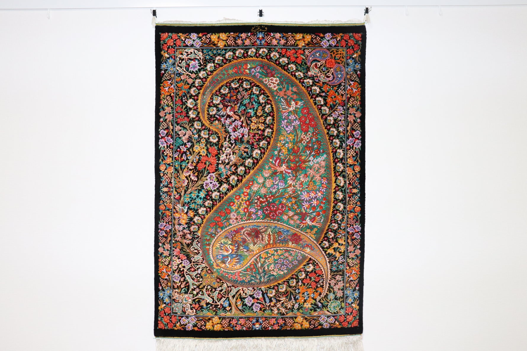 アルバル工房が誇る本作品は、伝統的なペイズリー柄(Botteh/ボテ)をモチーフにした、カラフルで華やかなシルクペルシャ絨毯です。フィールド全体に広がるカラフルな模様が、ペイズリー柄の繊細さと大胆さを際立たせています。黒いボーダーカラーが全体を引き締め、絨毯全体のデザインバランスを完璧に整えています。