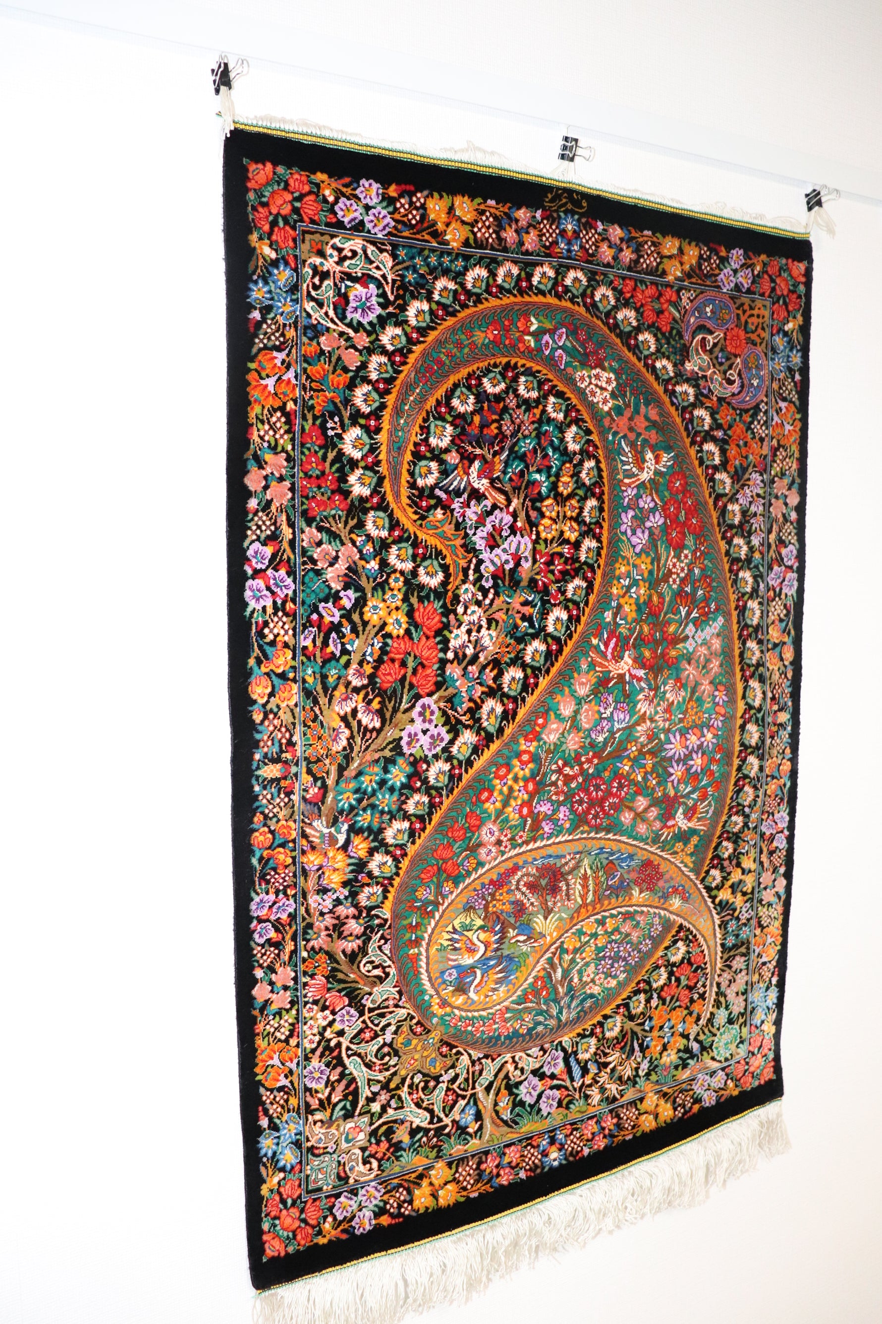 本作品は、110万ノット/平方メートルの高密度で手織りされており、シルクならではの光沢と柔らかな手触りが特徴です。カラフルなフィールドカラーが空間を明るく彩り、ペイズリー柄の流れるようなラインが独特のリズムを生み出しています。黒いボーダーには繊細な装飾が施され、全体のデザインを引き立てながら、シックな印象も与えています。
