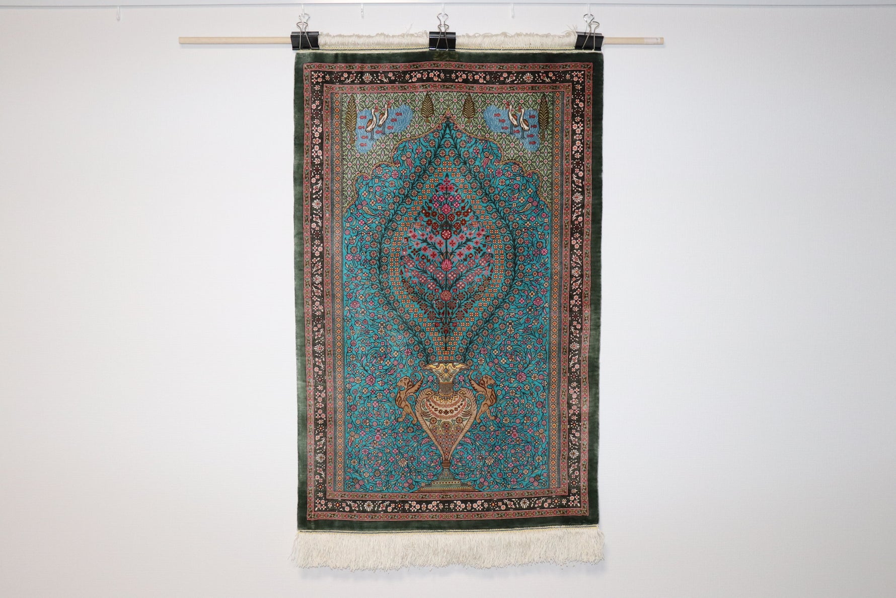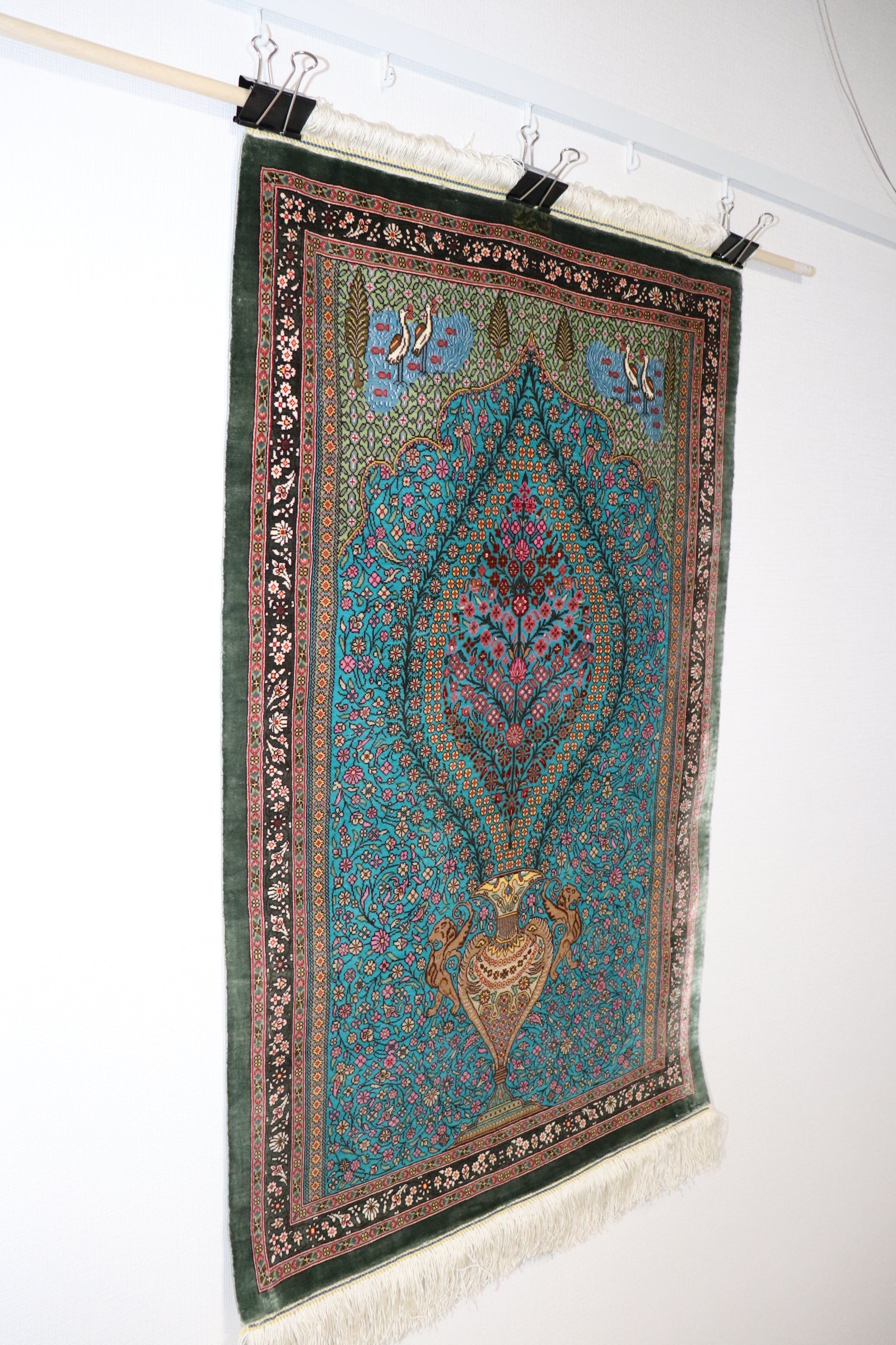 ペルシャ絨毯 クム産 シルク100% [アルバル工房] オリジナル花瓶柄 グリーン 壁飾りに最適 最高クラスの逸品 ID14008