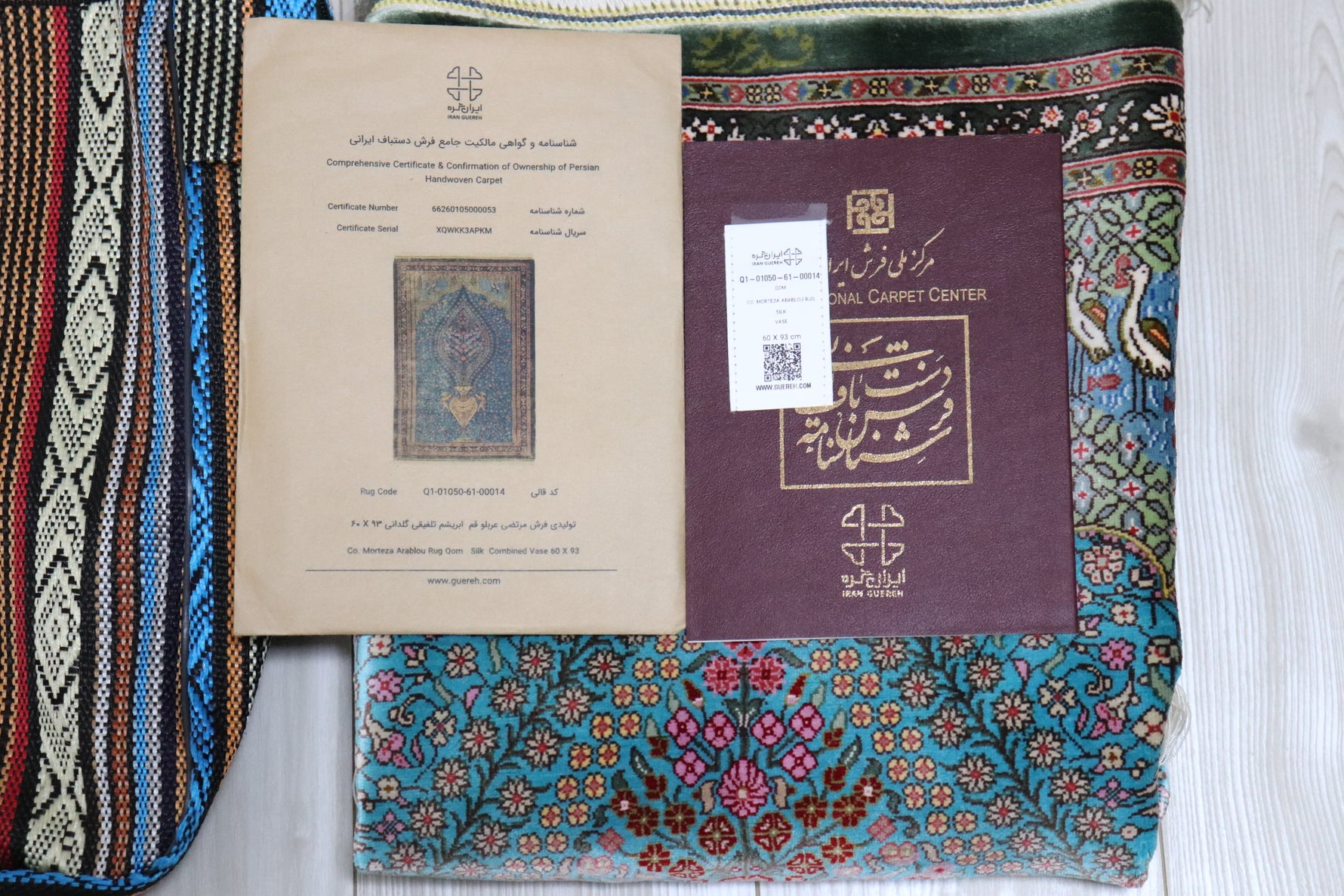 アルバル工房が手掛ける本作品は、青緑のフィールドカラーに美しい花瓶柄(Goldani)をあしらった高級ペルシャ絨毯です。94 cm x 60 cmというコンパクトなサイズながら、独特の存在感を持ち、特に壁飾りとしてその魅力を発揮します。高級感漂うグリーンのボーダーカラーが全体のデザインを引き締め、調和の取れた華やかさを演出しています。