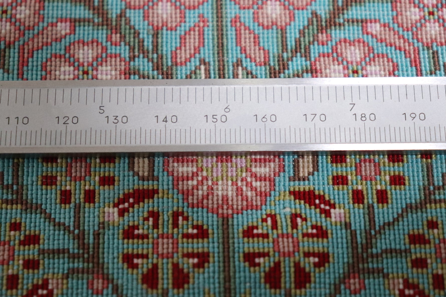 本作品は、伝統的な花瓶文様が細部に至るまで緻密に織り込まれており、その華やかなデザインは空間を格上げする力を持っています。青緑のフィールドカラーとグリーンのボーダーの組み合わせは、落ち着きと気品を兼ね備え、あらゆるインテリアにマッチします。