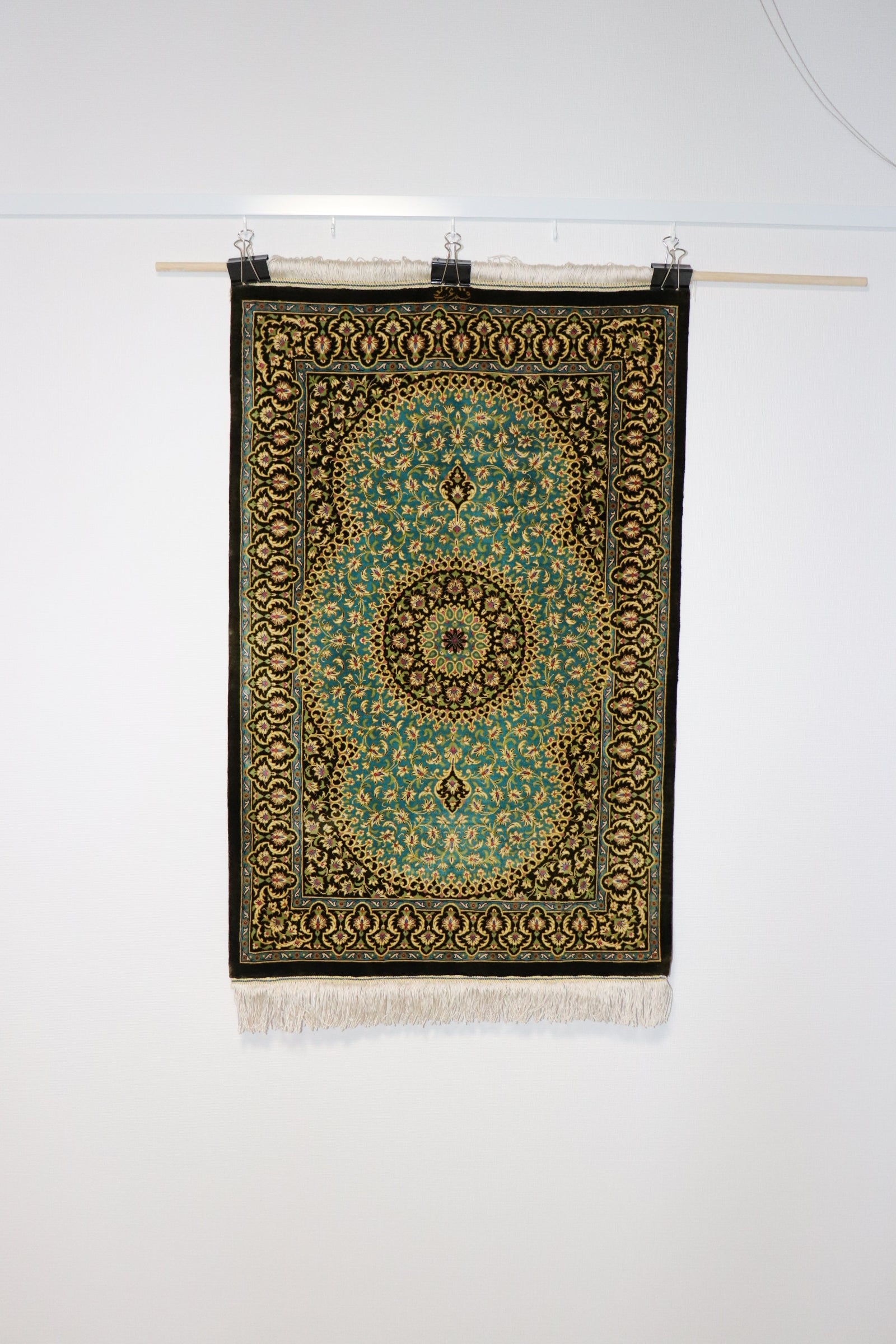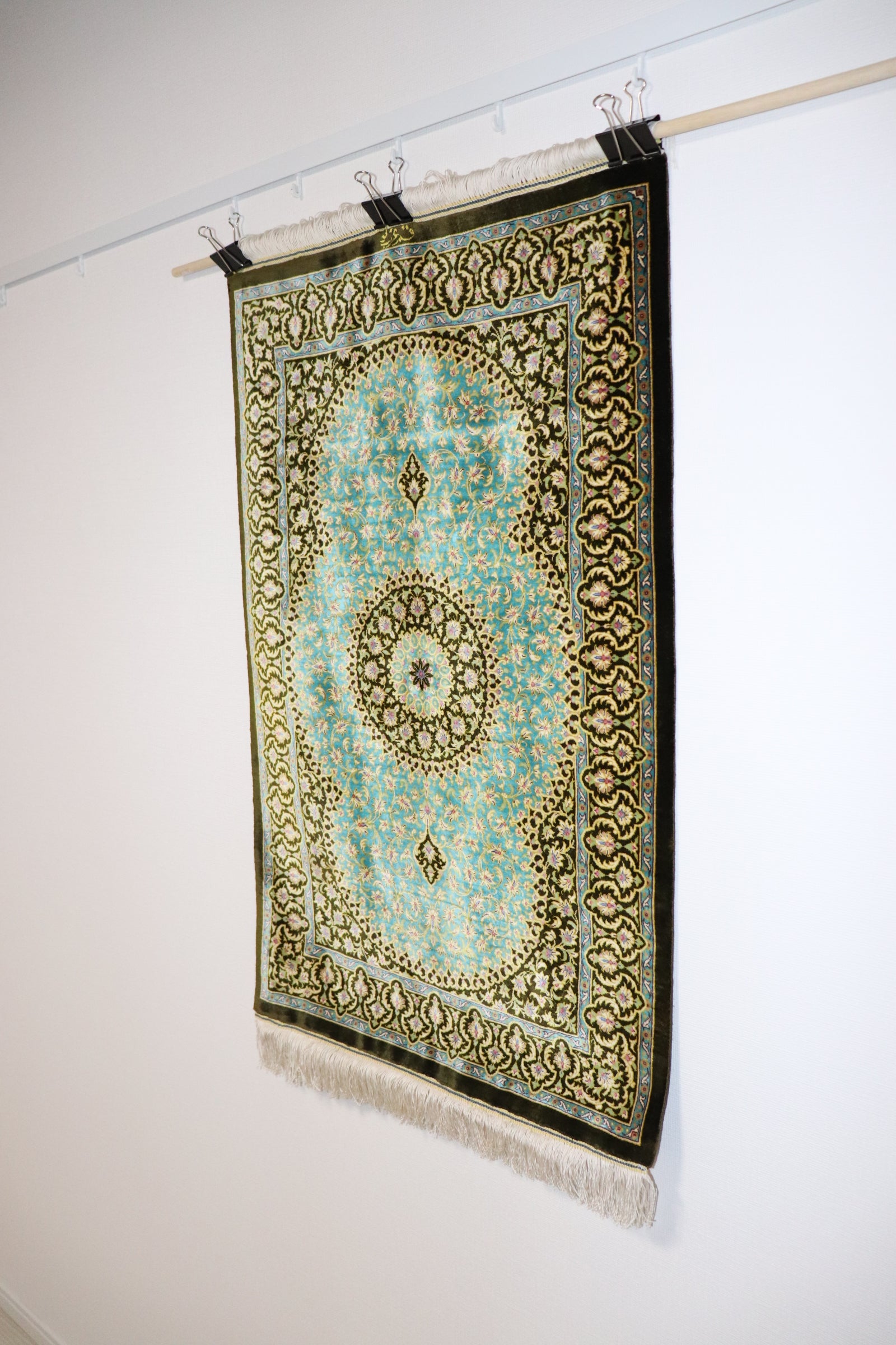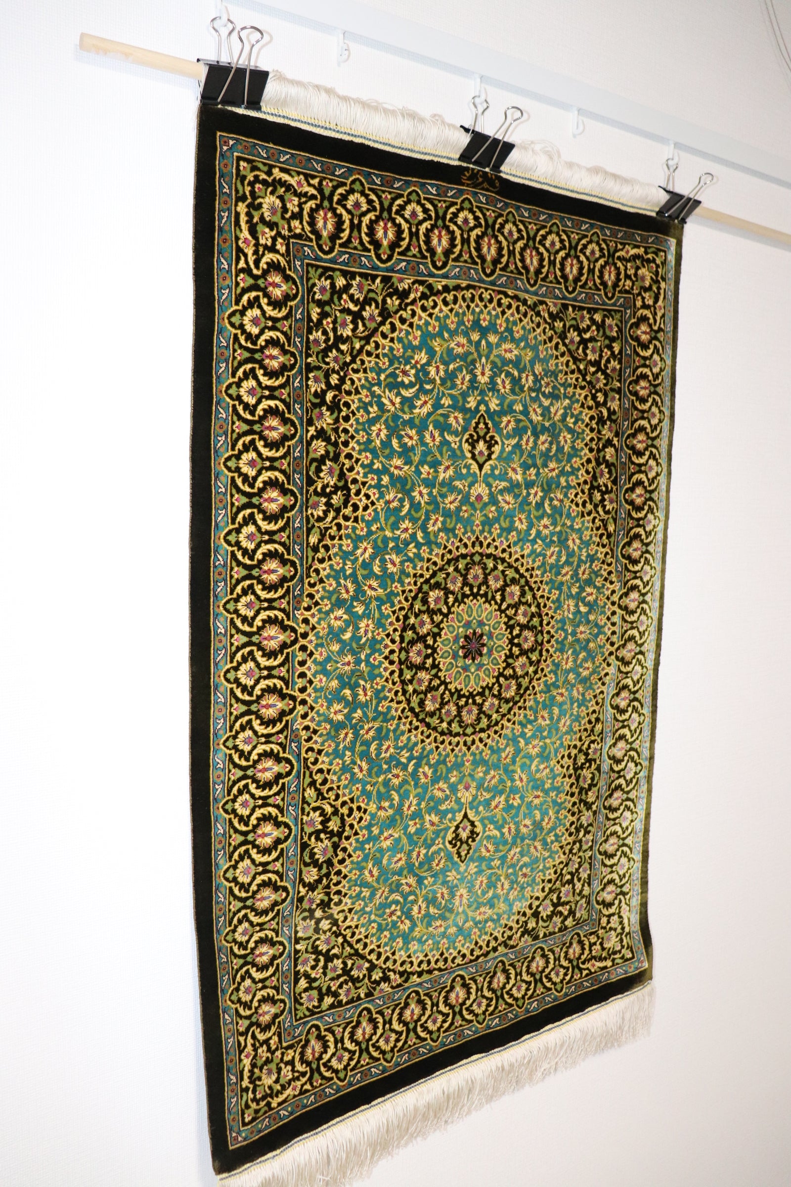中央に配置されたメダリオン文様は、工房のオリジナルデザイン「Golriz(小さい花)」を採用しており、細かな花々が丁寧に描かれています。深い鶯色の落ち着きと青緑の爽やかさが融合し、見る者に癒しと気品を感じさせる仕上がりです。