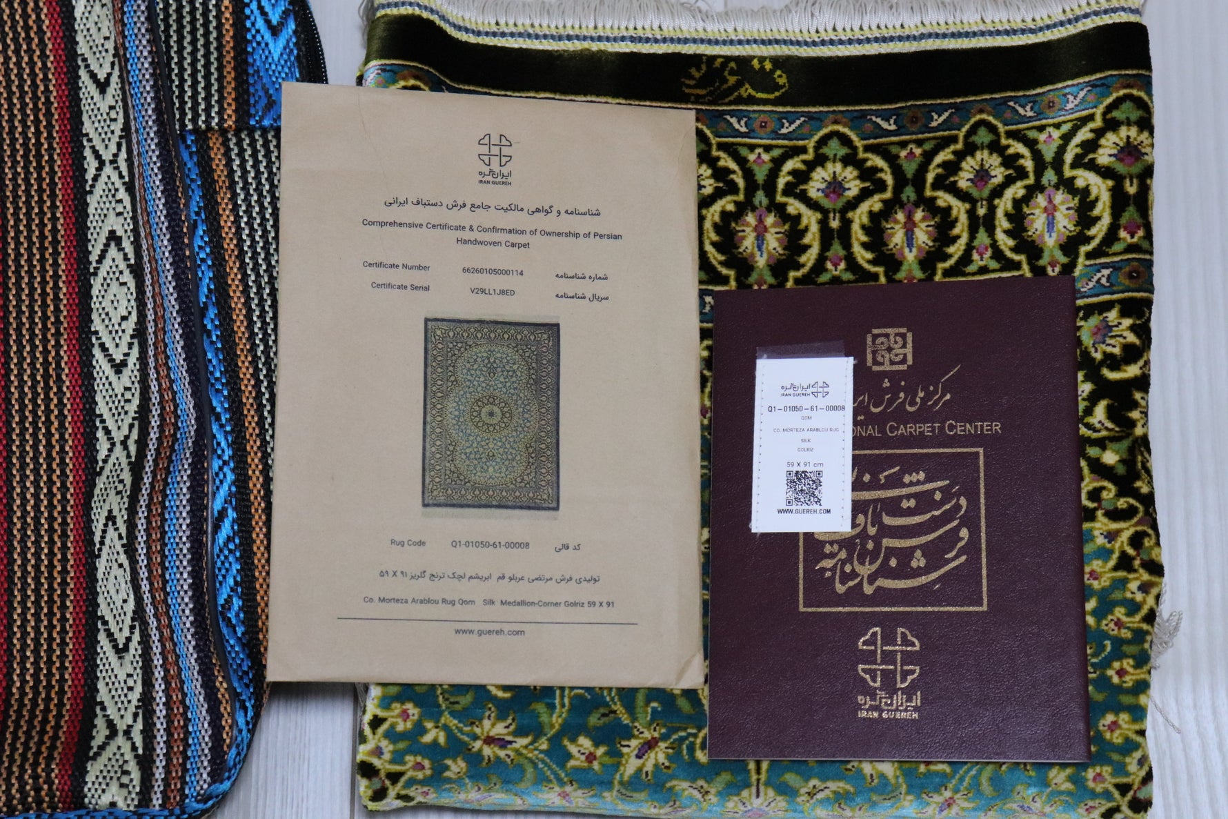 アルバル工房が手掛けた本作品は、深い鶯色のボーダーカラーと青緑のフィールドカラーが織り成す絶妙な配色バランスが特徴のペルシャシルク絨毯です。サイズは91 cm x 59 cmと使いやすいコンパクトな設計で、特に玄関マットとしての使用に適しています。繊細で洗練されたデザインが空間を優雅に演出します。