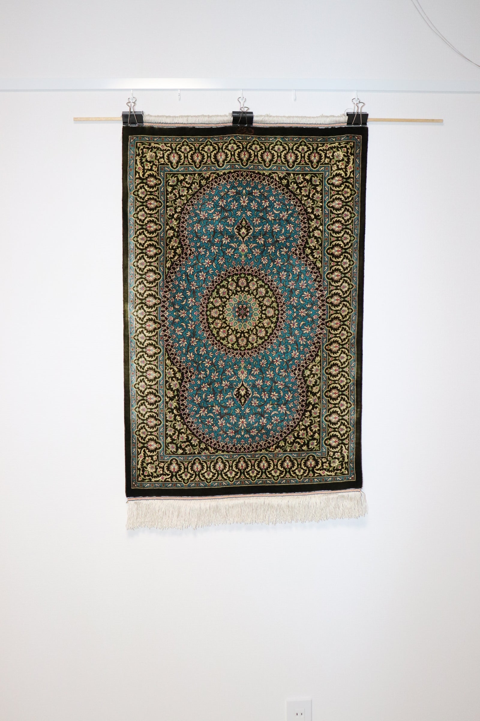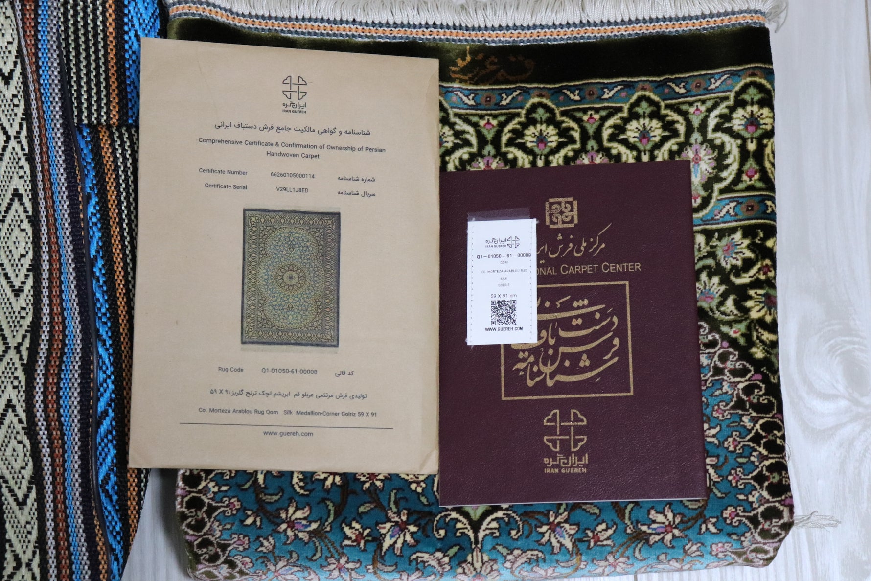 ペルシャ絨毯 クム産 シルク100% [アルバル工房] 人気作品 深い鶯色×青緑の美しい調和 玄関マットに最適 ID14013