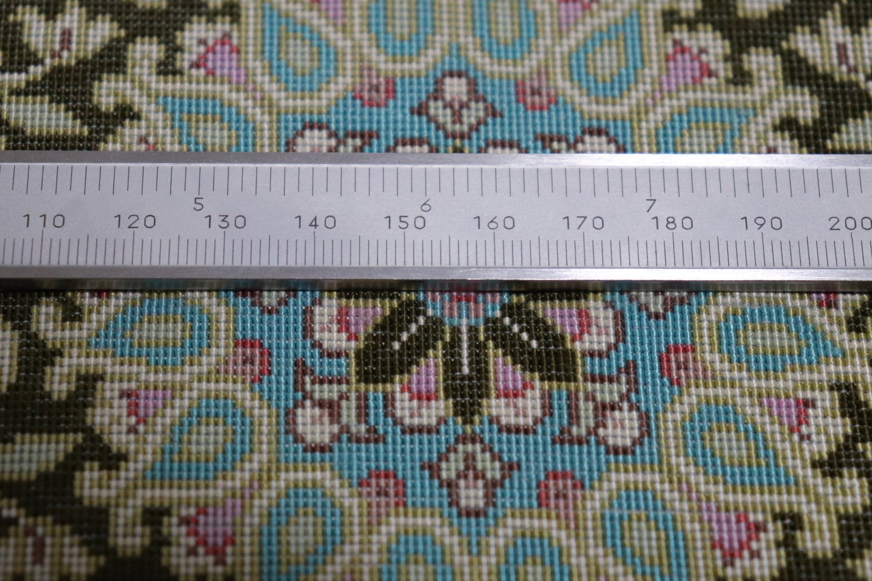中心には美しいメダリオン文様が施され、小さな花々が繊細に描かれた「Golriz」デザインが、シルク特有の光沢感と相まって優雅さを引き立てています。深い鶯色は落ち着いた雰囲気を醸し出し、青緑との調和が見る者に穏やかな印象を与えます。