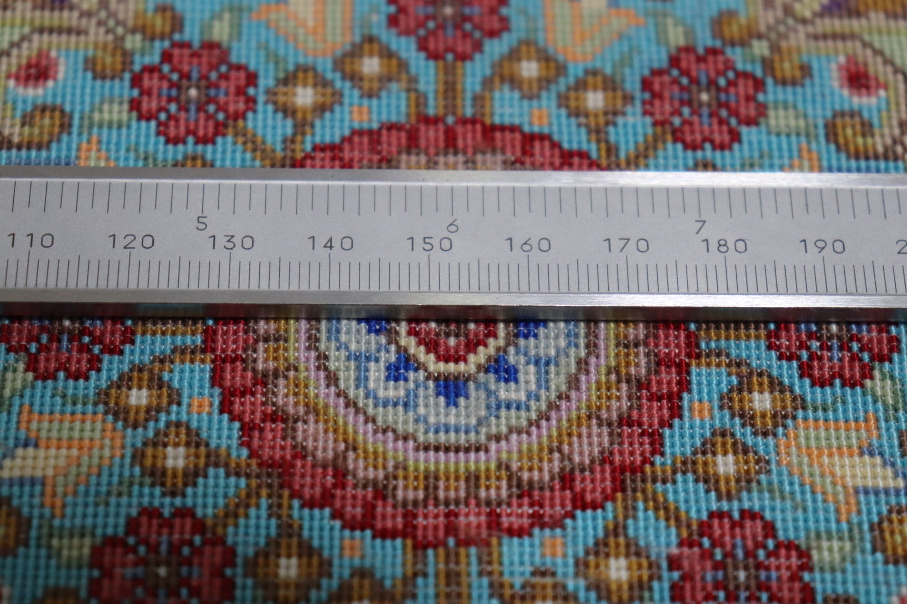 本作品は、アルバル工房による最高級の手織りシルク絨毯で、鮮やかなスカイブルーをフィールドカラーに、深い紫色のボーダーが美しいコントラストを生み出しています。中央にはメダリオン柄が細部まで緻密に織り込まれ、周囲を彩るラチャク・トランジ文様が優雅な雰囲気を演出しています。