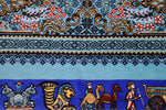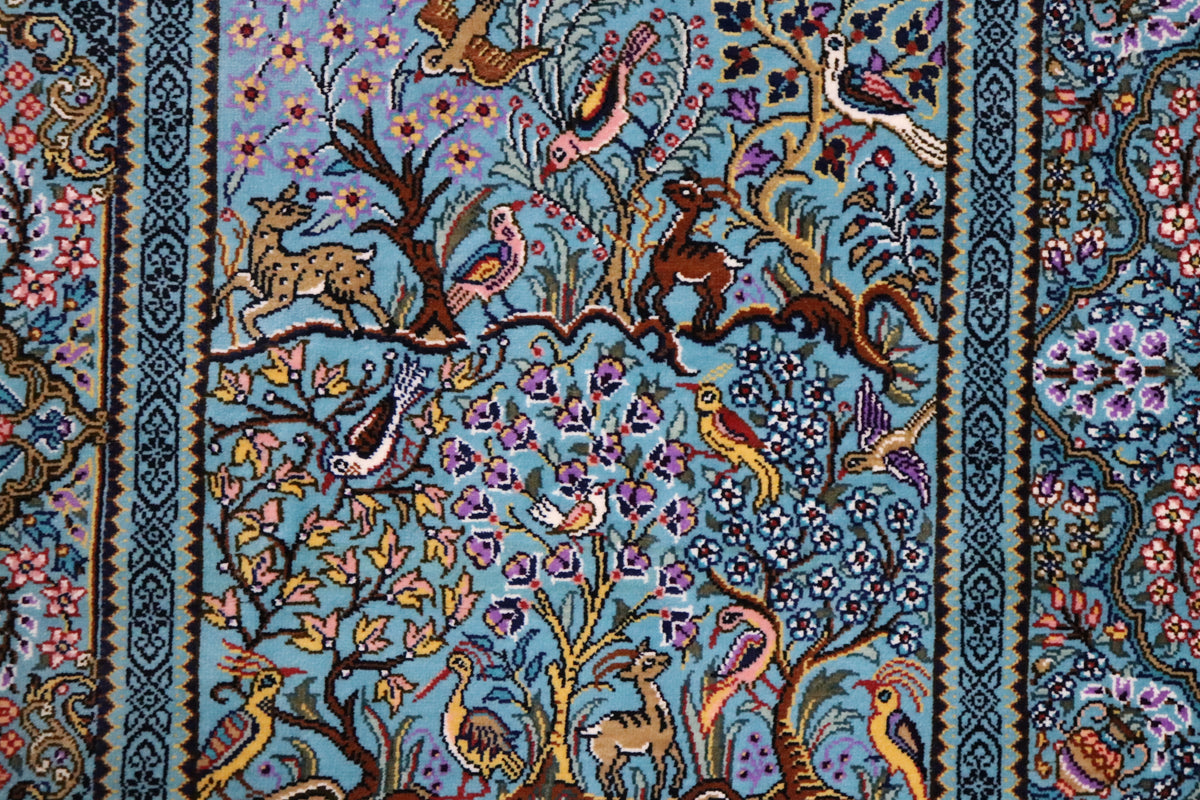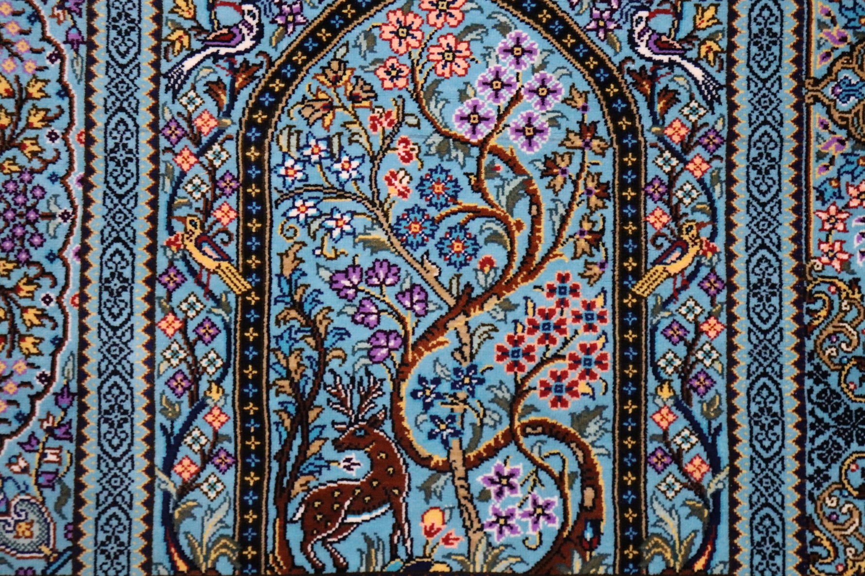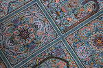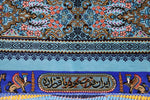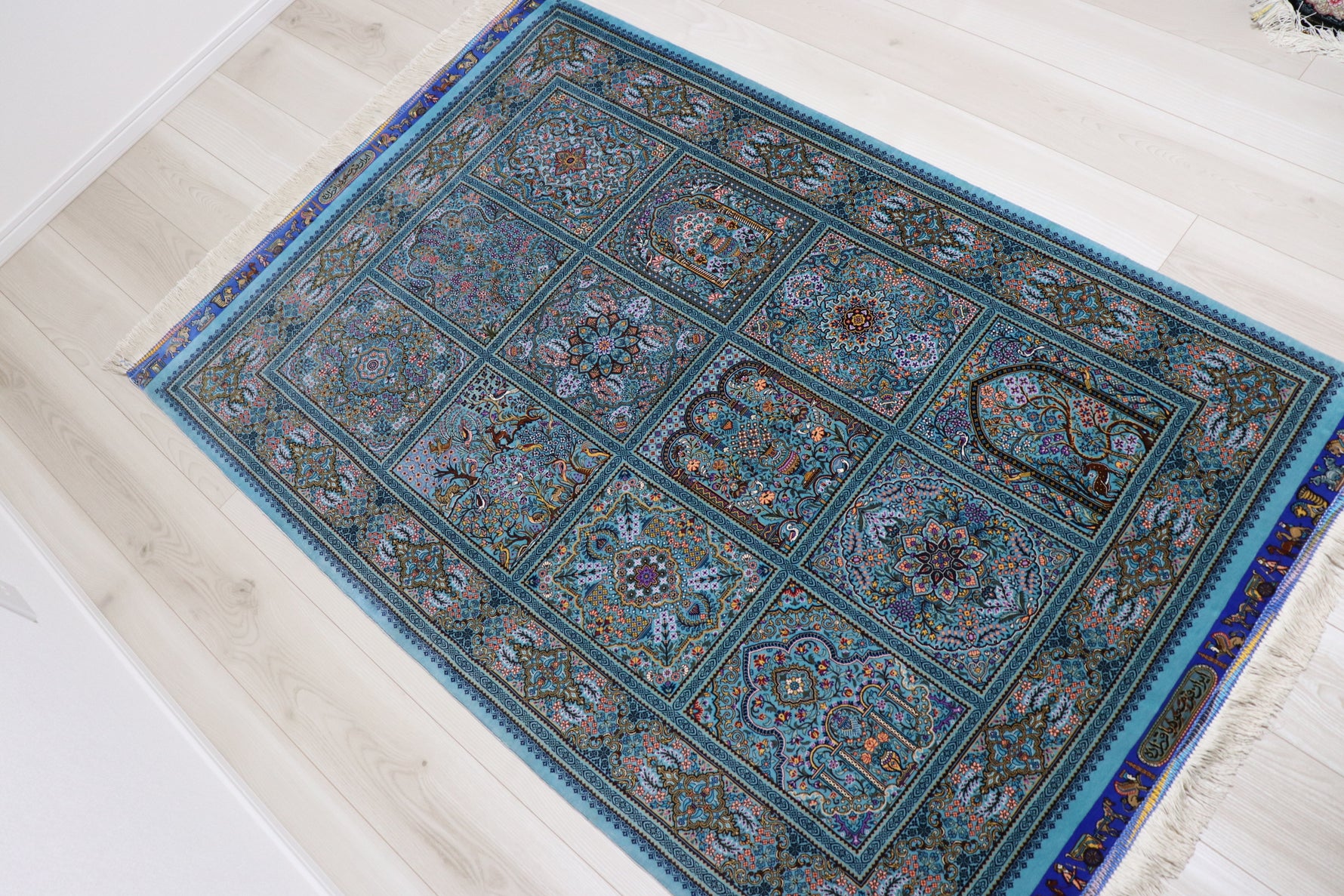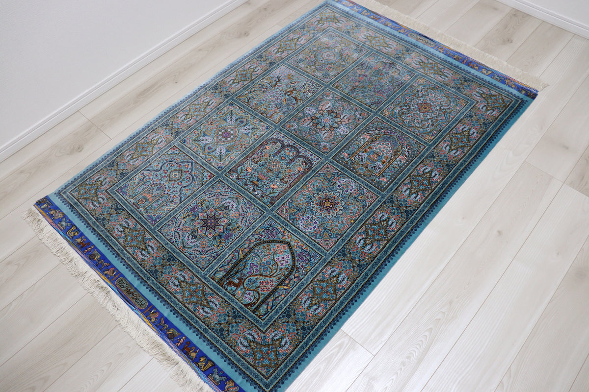 各パネルにはペルシャ文化に根ざした象徴的なモチーフが施されており、生命の樹や幾何学模様、花瓶と花々、さらには鹿や鳥など自然界の要素が繊細に描かれています。これらは、豊かな自然や調和を象徴し、見る人々に希望と安らぎをもたらします。さらに、絨毯の縁部分には繊細なフレームデザインが施され、全体の調和をさらに引き立てています。