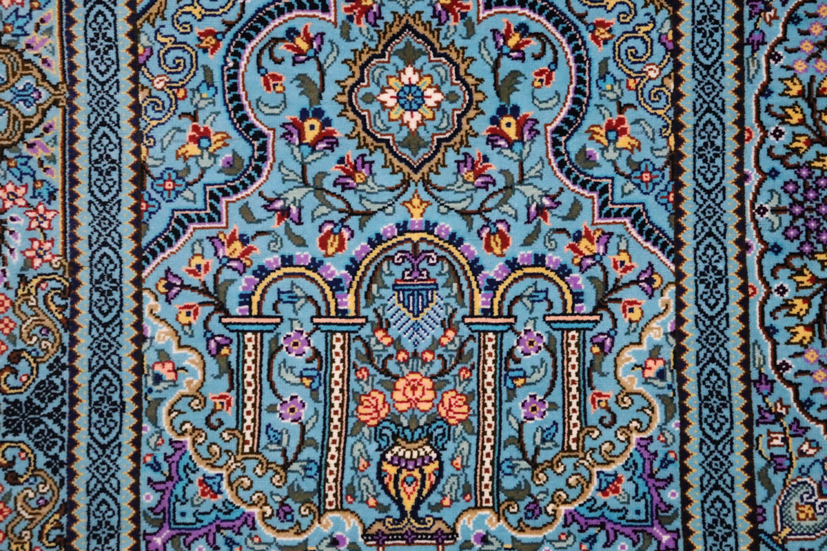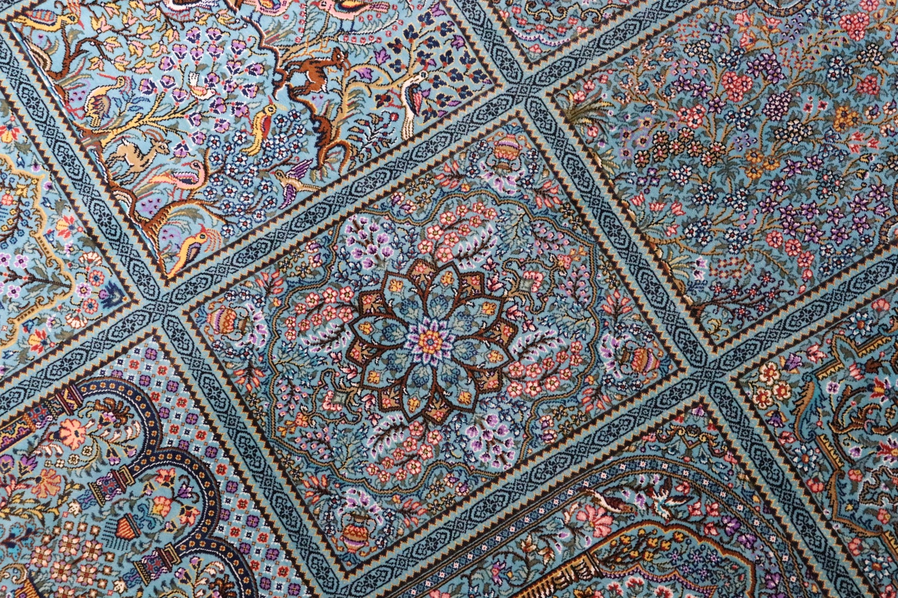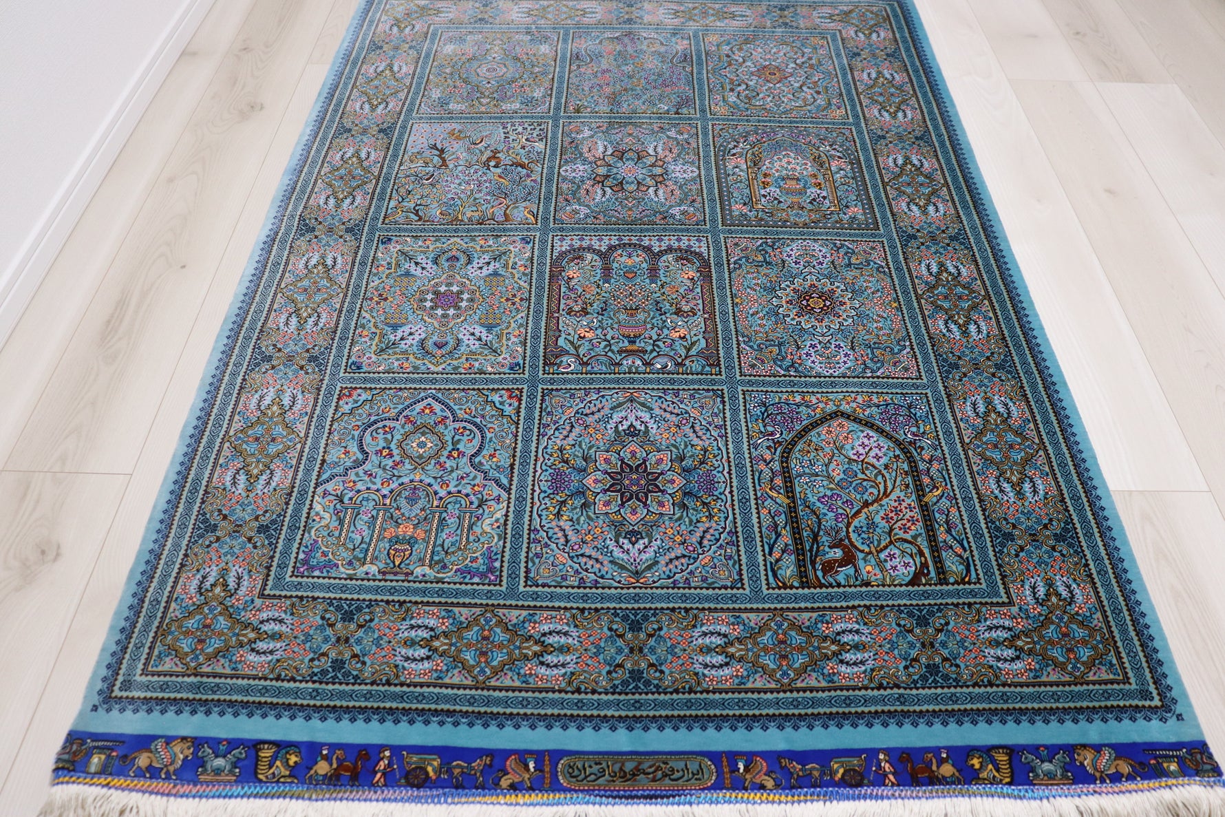 バゲルザデ工房の名を世界に広めた傑作。優雅なスカイブルーとパネルデザインの融合が描く、究極のシルクペルシャ絨毯。