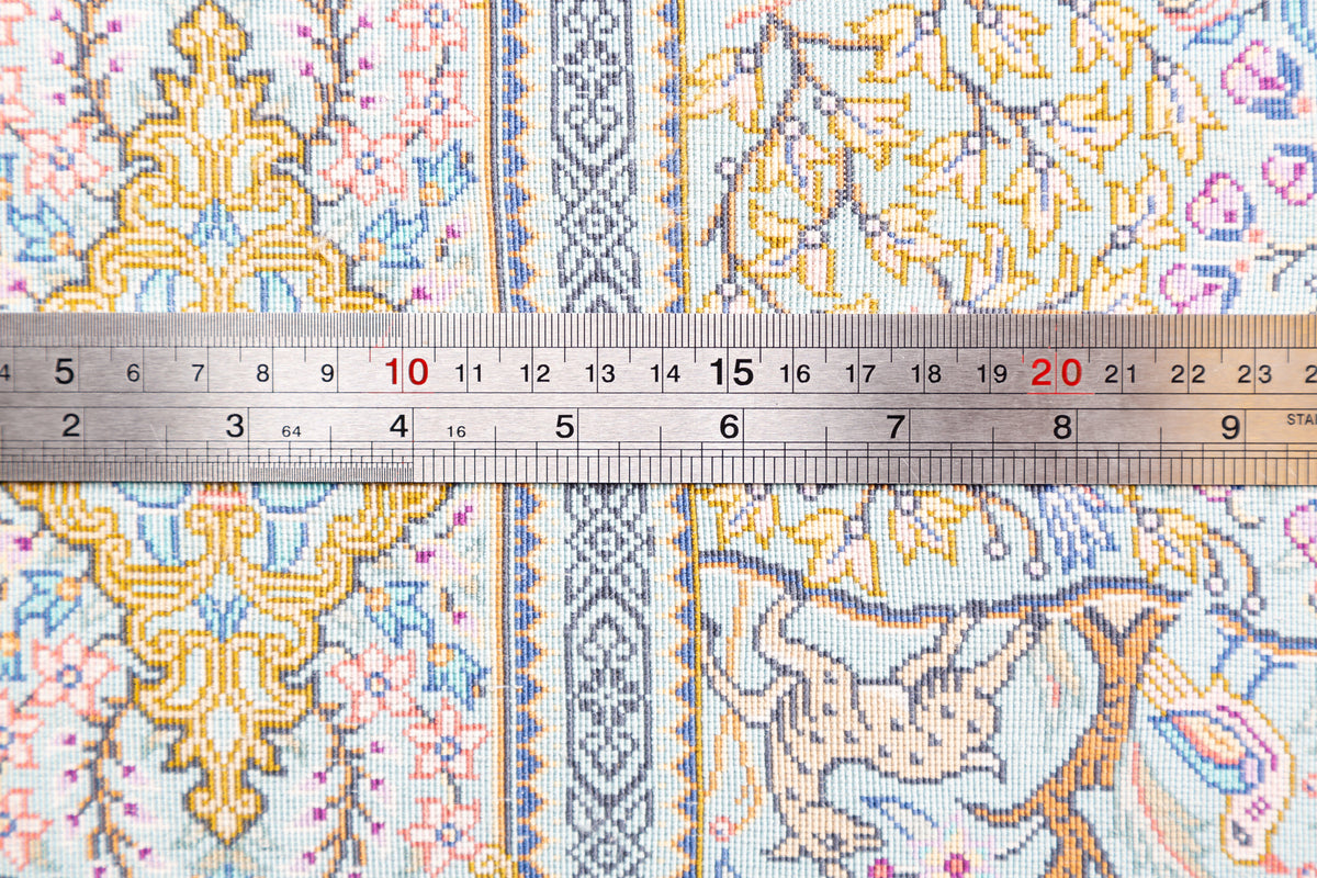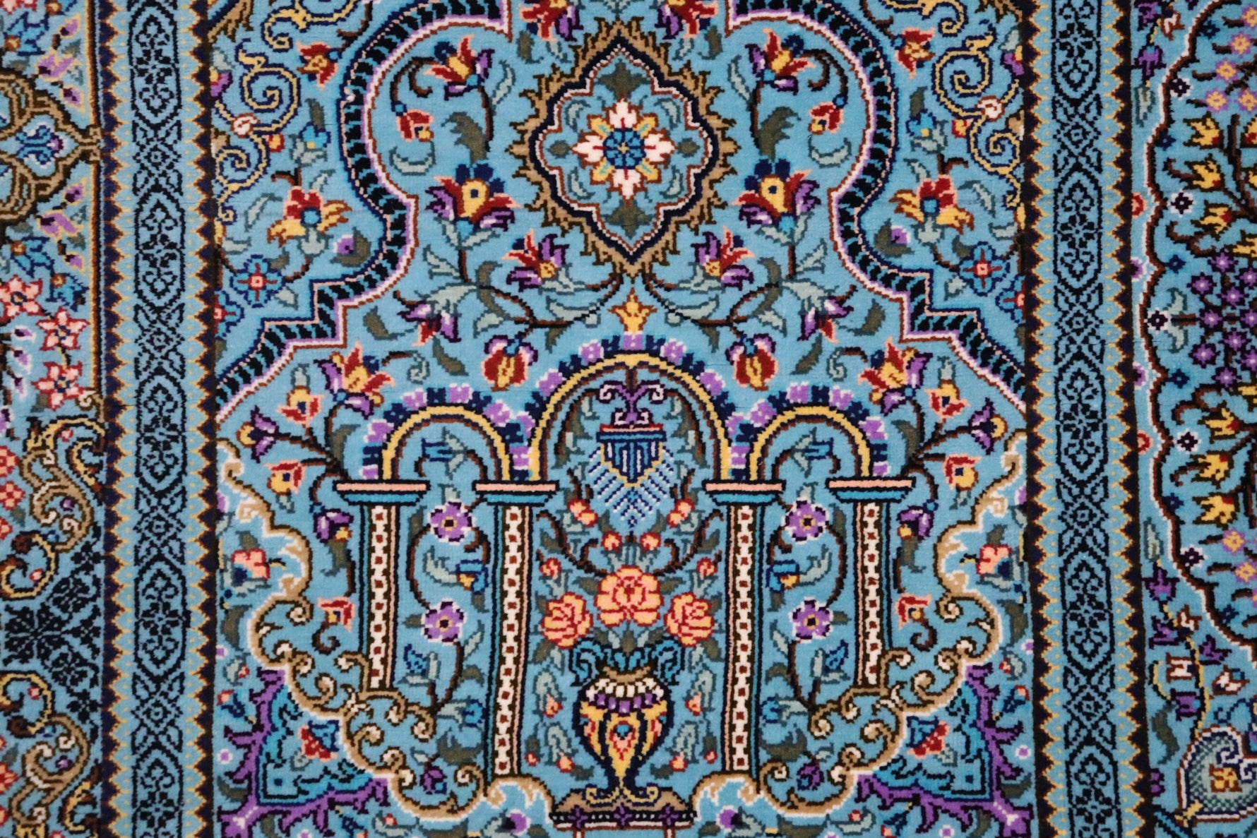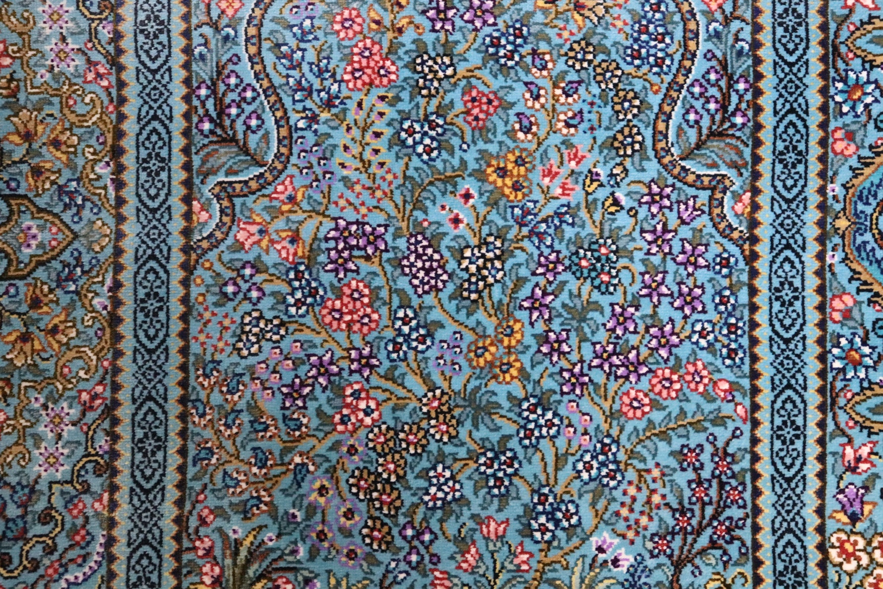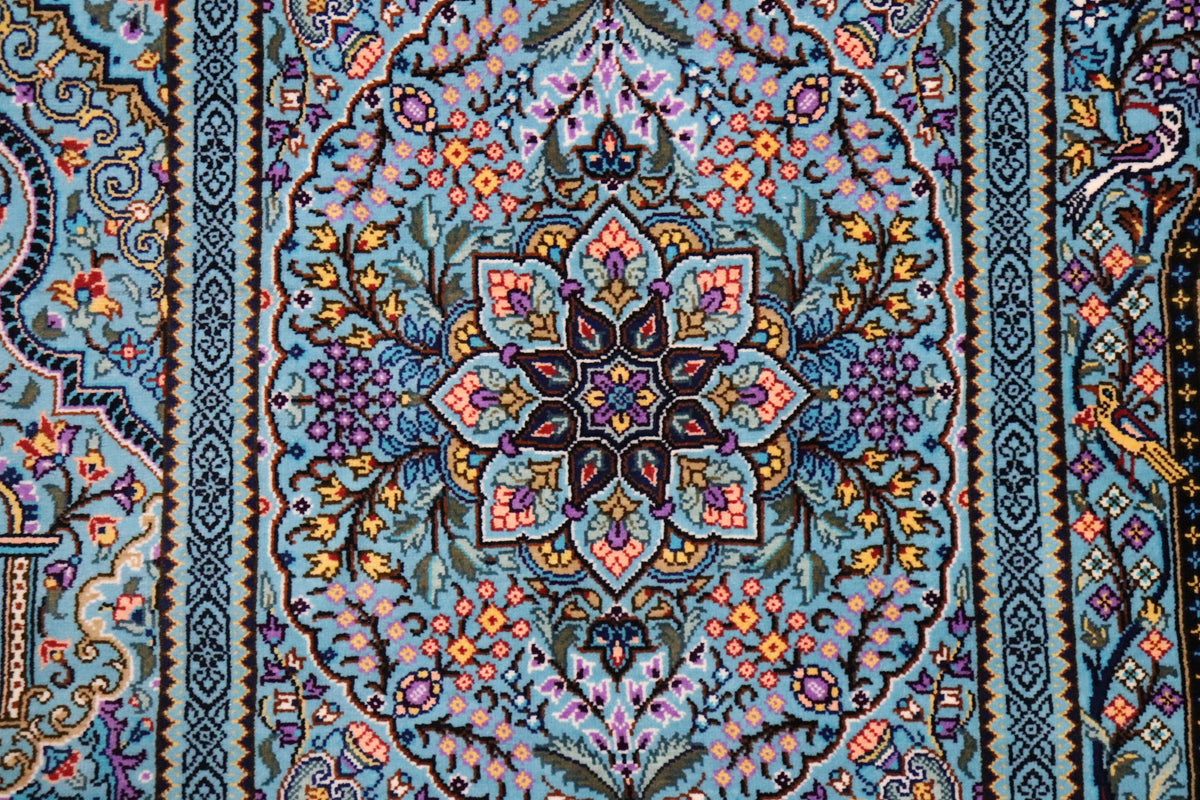 使用されている素材はシルク100%で、光沢感と滑らかな手触りが特徴です。こちらの絨毯は120万ノット平方メートルという高密度で織られており、緻密で耐久性のある仕上がりになっています。手織りの技術が生む細部の精密さは、こちらの作品を特別なものにしています。