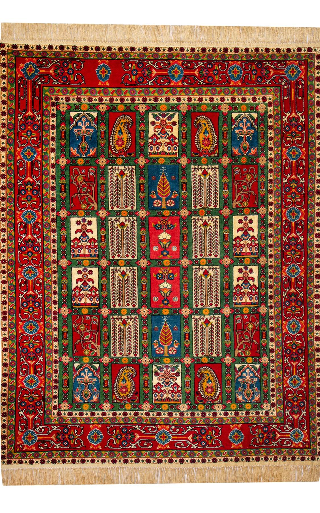 遊牧民スタイルの素朴で温かいデザインに、シルクの上品な輝きをプラスした、ホラーサーン産の手織り絨毯です。この絨毯は、縦糸にシルクを使った「シール縦糸」という作り方をしています。そのため、ウールだけの絨毯よりも、少し軽やかで、しなやかな風合いに仕上がっています。
