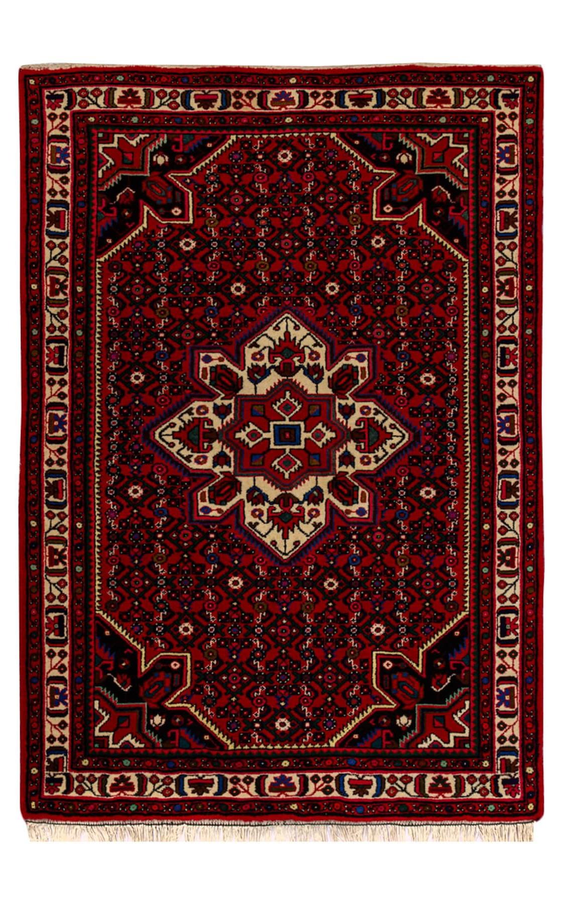 お部屋の主役になるような、印象的な一枚をお探しの方にぴったりの、ハマダン・ホセインアバード産の手織り絨毯です。まず目に飛び込んでくるのは、深く美しいレッド(赤色)。その鮮やかな地に、とても細かい模様が丁寧に織り込まれており、その美しい色の組み合わせが見事です。