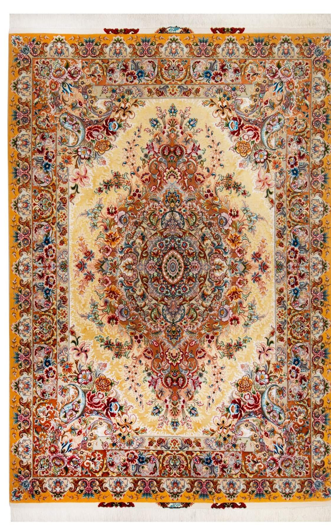 まるで光そのものを織り込んだかのような、ゴージャスな輝きで空間を満たすタブリーズ産の手織りペルシャ絨毯です。タブリーズの芸術的な工房作「カティビ柄」を、華やかで豪奢なゴールドを基調とした色合いで表現しました。