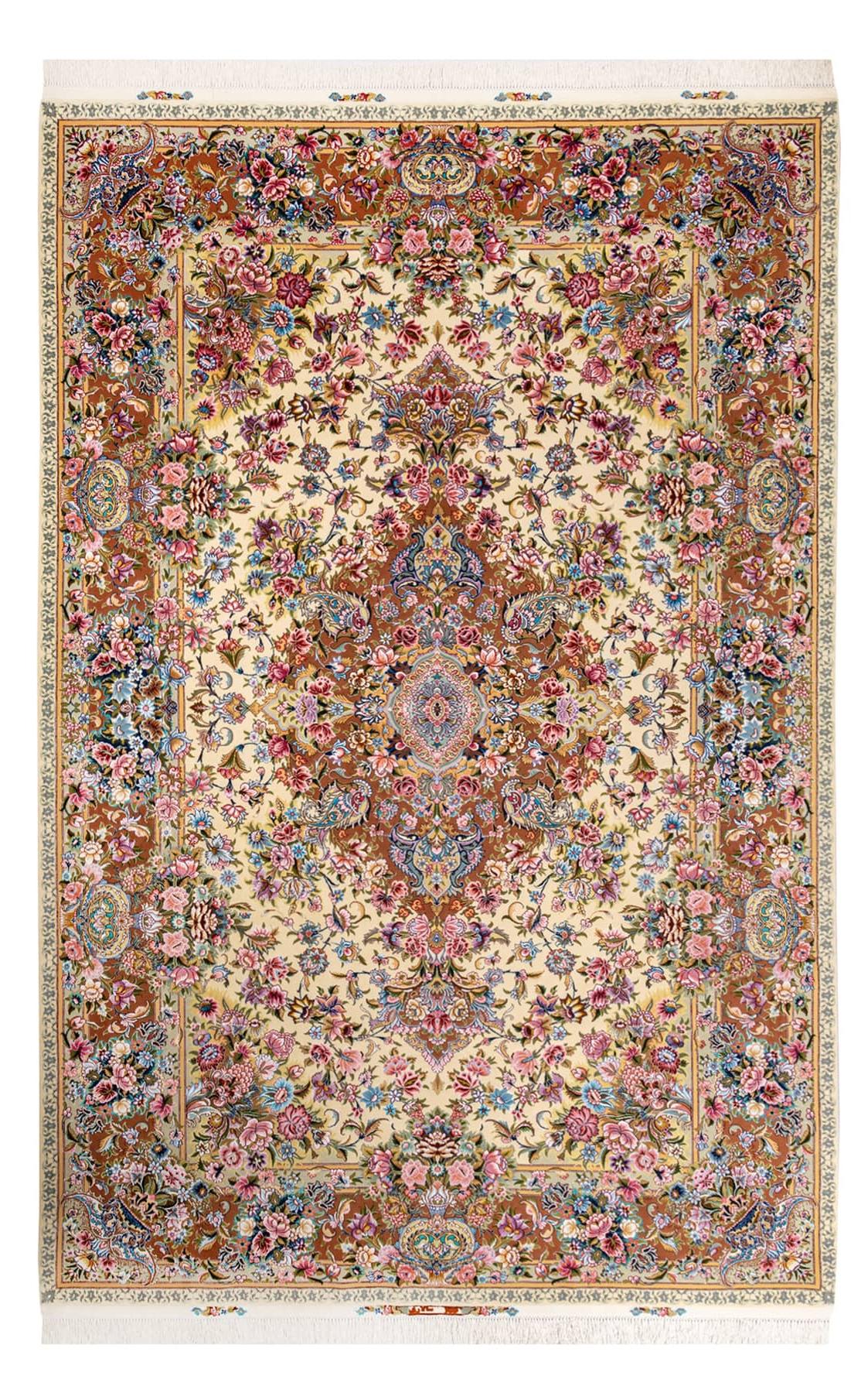 優美で気品あふれるインテリアの理想を、この一枚で。タブリーズの名高い工房の証である「サラーリ柄」を、約6畳という贅沢な大判サイズで織り上げた、最高級の手織りペルシャ絨毯です。その特別な価値は、素材と技術の融合にあります。