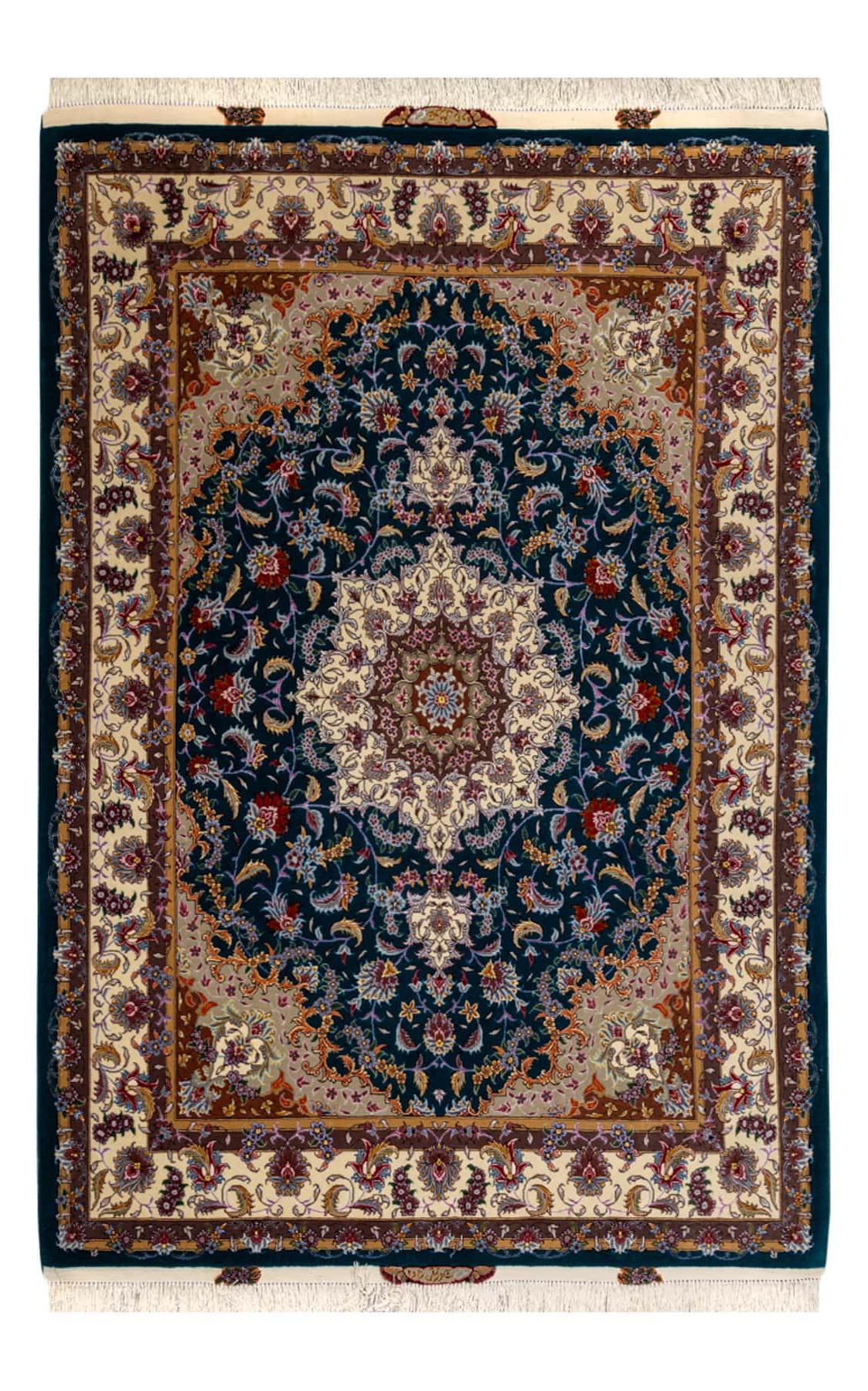 高品質なウールの心地よい肌触りも魅力。デザインと品質を兼ね備えた、特別な青いペルシャ絨毯をお探しの方におすすめしたい一枚です。
