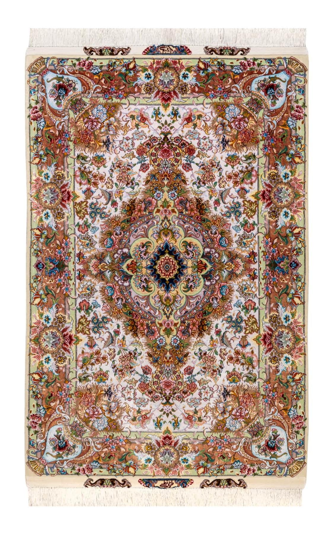 有名産地タブリーズで作られた、高品質な手織りペルシャ絨毯です。お部屋を明るく見せるクリーム色の地に、優雅で芸術的な「カティビ柄」が織り込まれています。