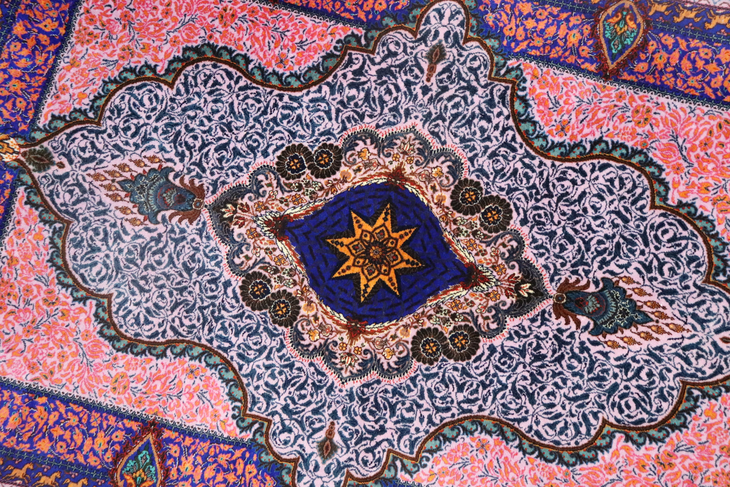 クム産のシルクを100%使用し、その美しさと繊細さが魅力の逸品です。フィールドカラーには鮮やかなカラフルな色合いが使われ、ピンクのボーダーが全体に温かみと華やかさを加えています。色合いはどんなインテリアにも調和し、特に華やかな空間に最適です。