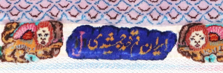 サイン部分には、美しいペルシア語の書体で「イラン・クム・モハマド・ジャムシディ MJ」と書かれており、両端には剣を持つライオンと太陽の模様が描かれています。これは、ペルシャ絨毯において 王権、力、正義、知恵、伝統の象徴 として用いられています。