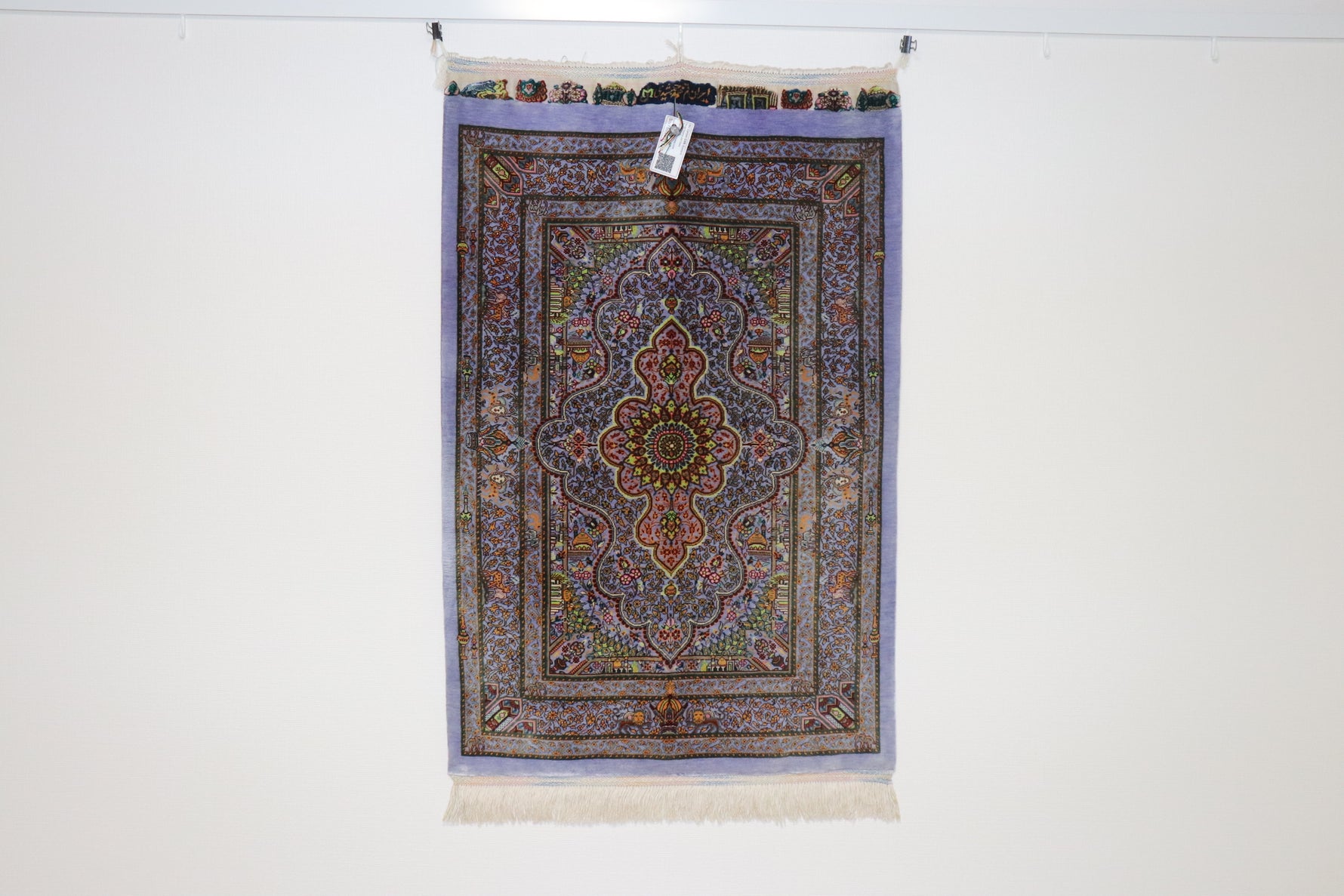ペルシャ絨毯 クム産 シルク100% [アルバル工房] 工房の傑作 紫×黄金 壮麗なメダリオンデザイン リビングサイズ ID23042