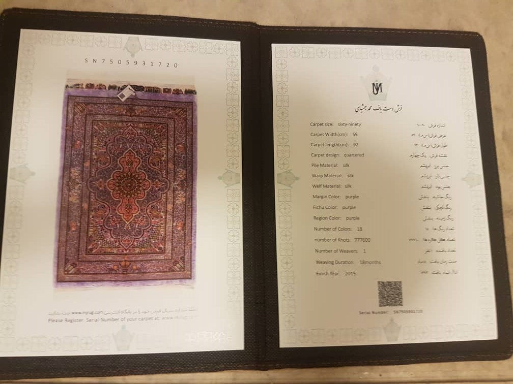 サイズは92 cm x 59 cm、リビングやエントランスに最適なサイズ感で、どんなインテリアにもぴったりフィットします。密度は140万ノット/平方メートル、総ノット数は77万ノットで、精緻な織り技術が光るこの絨毯は、18ヶ月という制作期間をかけて完成しました。耐久性と美しさを兼ね備えたこの絨毯は、長年にわたって愛されること間違いありません。