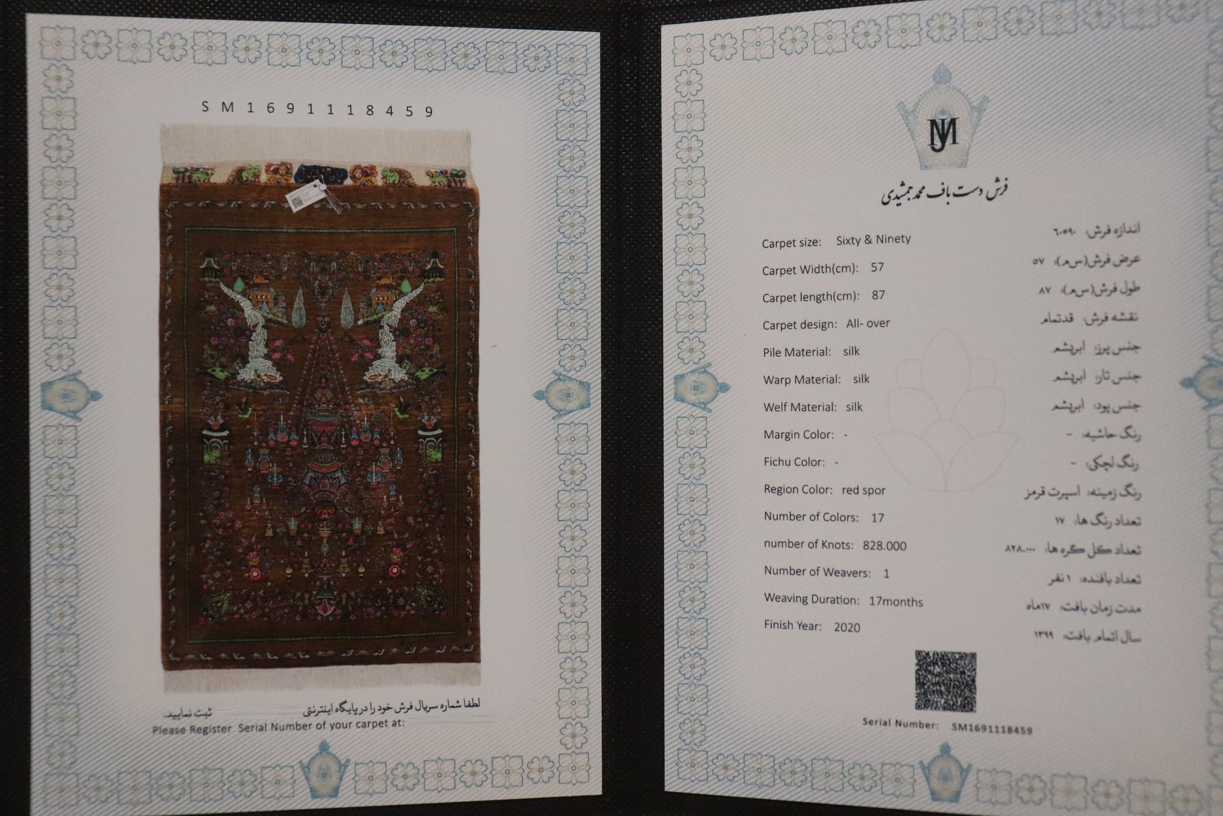 密度は170万ノット平方メートル、打ち込み総ノット数は84万ノットと高密度で、細部に至るまで精緻な織りが施されています。17ヶ月の制作期間を経て完成したこの絨毯は、優れた耐久性を持ちながら、柔らかな触感を楽しむことができます。サイズは87 cm x 57 cmで、使いやすくコンパクトなサイズ感が特徴です。