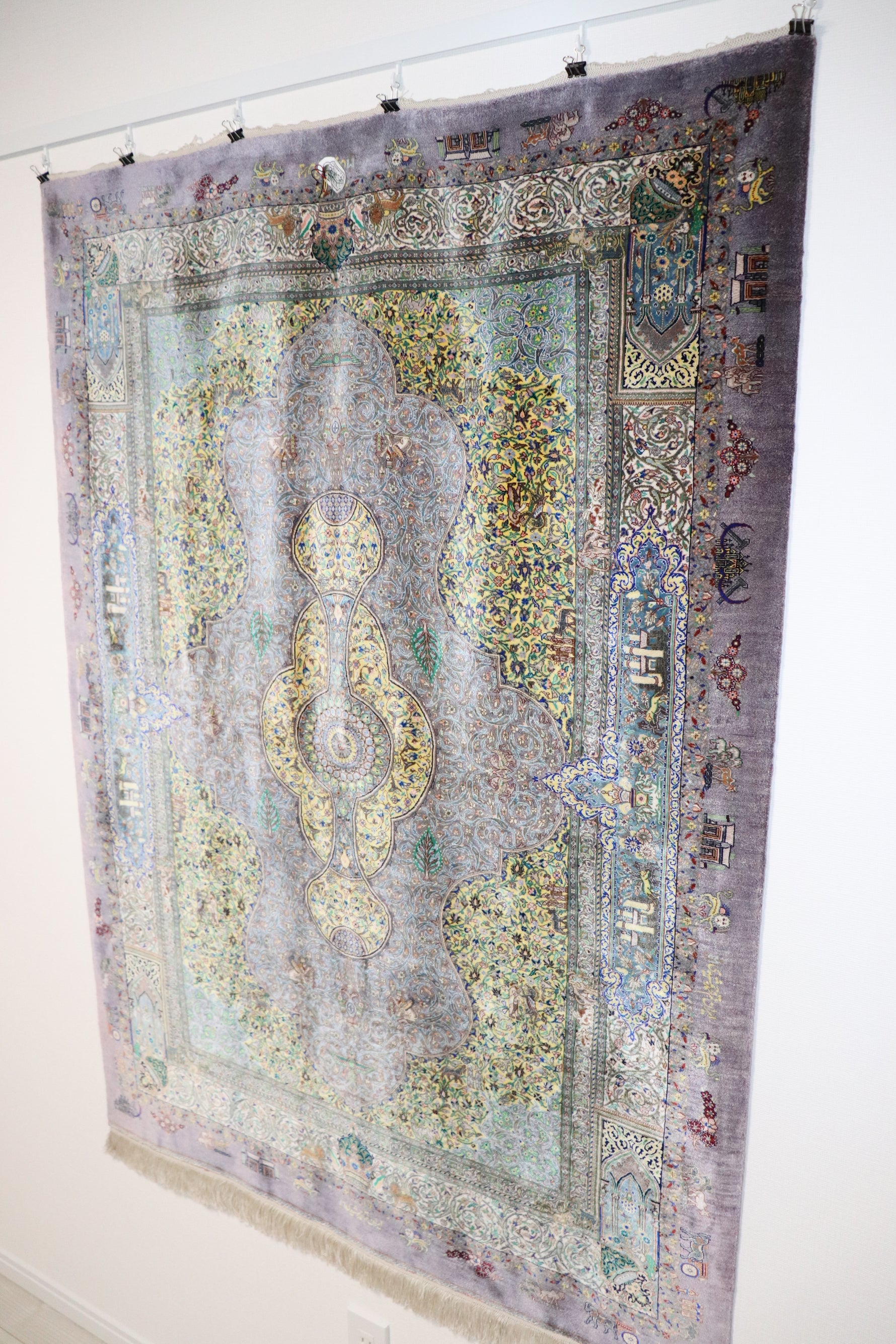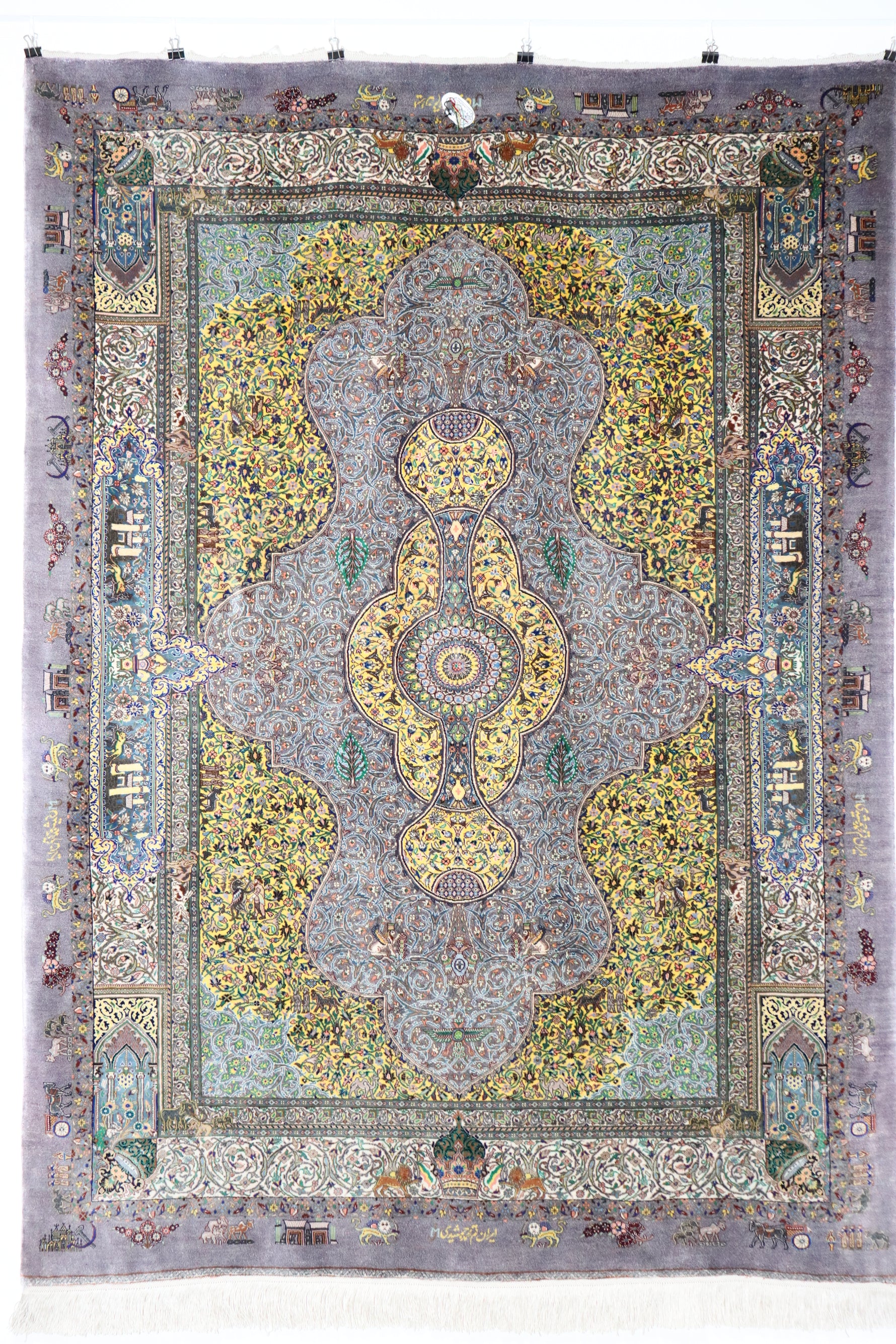 ペルシャ絨毯 クム産 シルク100% [アルバル工房] 工房の傑作 紫×黄金 壮麗なメダリオンデザイン リビングサイズ ID23042