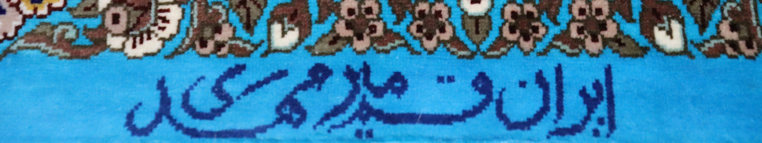 サイン部分には、美しいペルシア語の書体で「イラン・クム・ミルメヒディ」と書かれております。作品の各部位にさりげなく織り込まれた工房名が見える絨毯はミルメヒディが工房を総じて製作した自信作の証拠であると言われます。