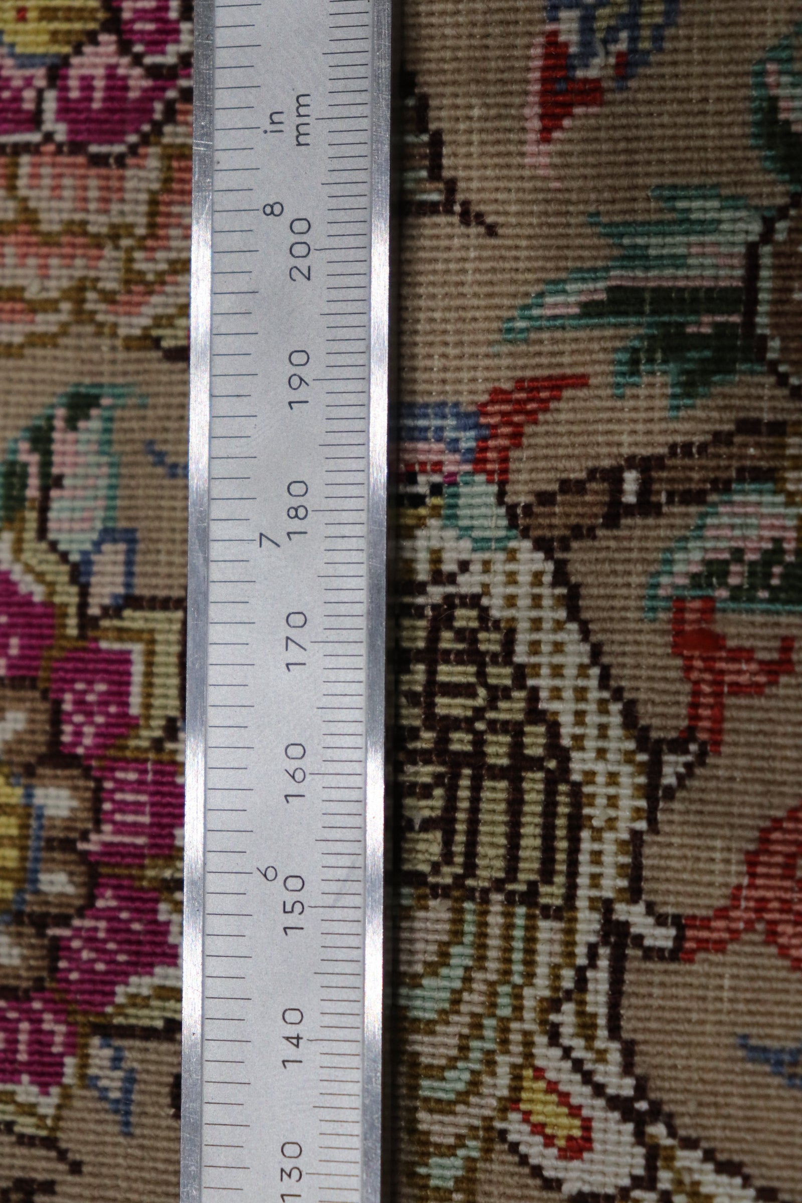 この絨毯は、セピアを基調としたフィールドカラーとボーダーカラーが、空間に落ち着きと上品さをもたらします。細やかな花模様と生命力あふれるデザインが調和し、見る人に安らぎと豊かさを感じさせます。素材には最高級のコルクウールとシルクが使用され、手触りは滑らかで光沢は上品そのものです。