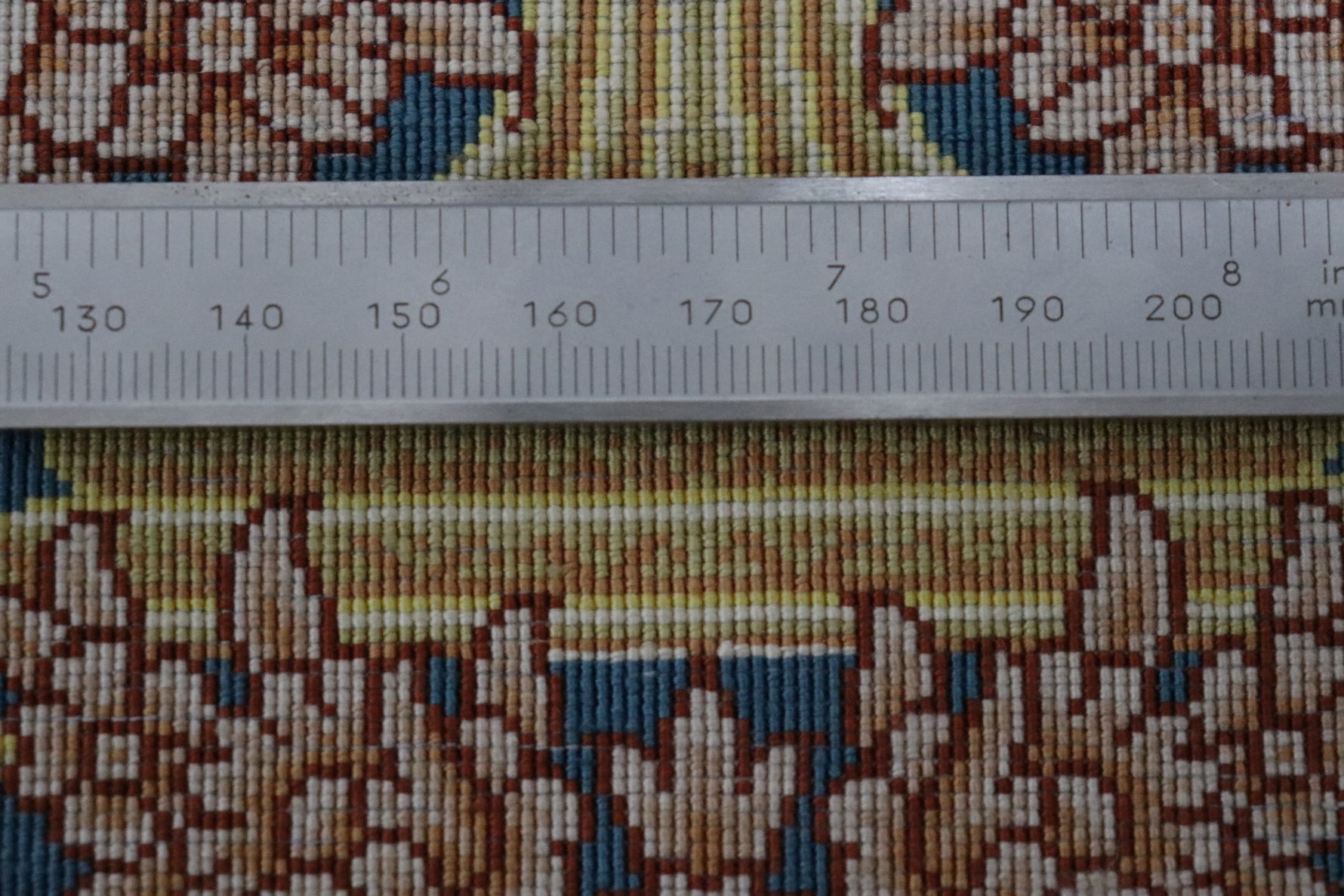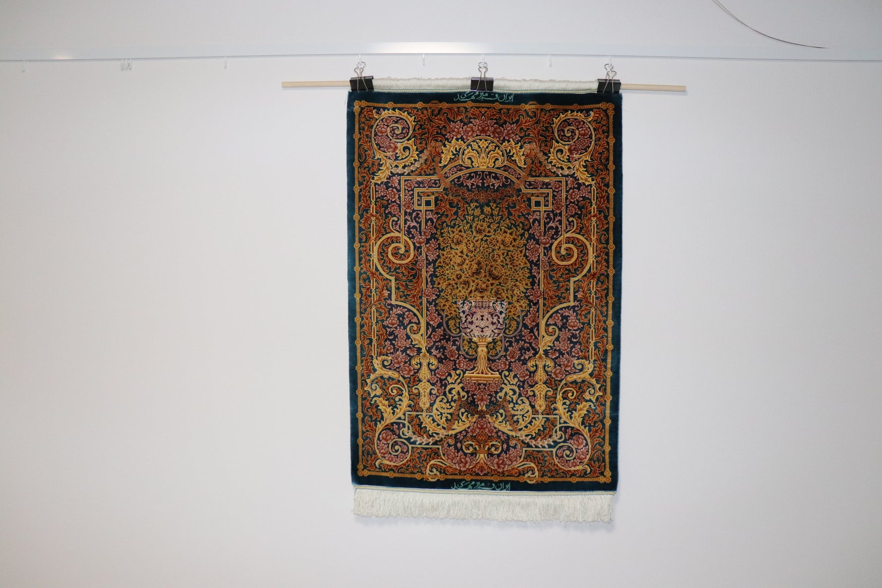 こちらは、ペルシャ絨毯の名産地クムにあるミルメヒディ工房による、芸術品のように美しい一枚です。「花瓶(Goldani)」のモチーフを中心に、緻密で優雅なデザインが広がり、その織りの美しさはまるで絵画のようです。壁掛けとして使用すれば、インテリアに格調高いアクセントを添えることができます。