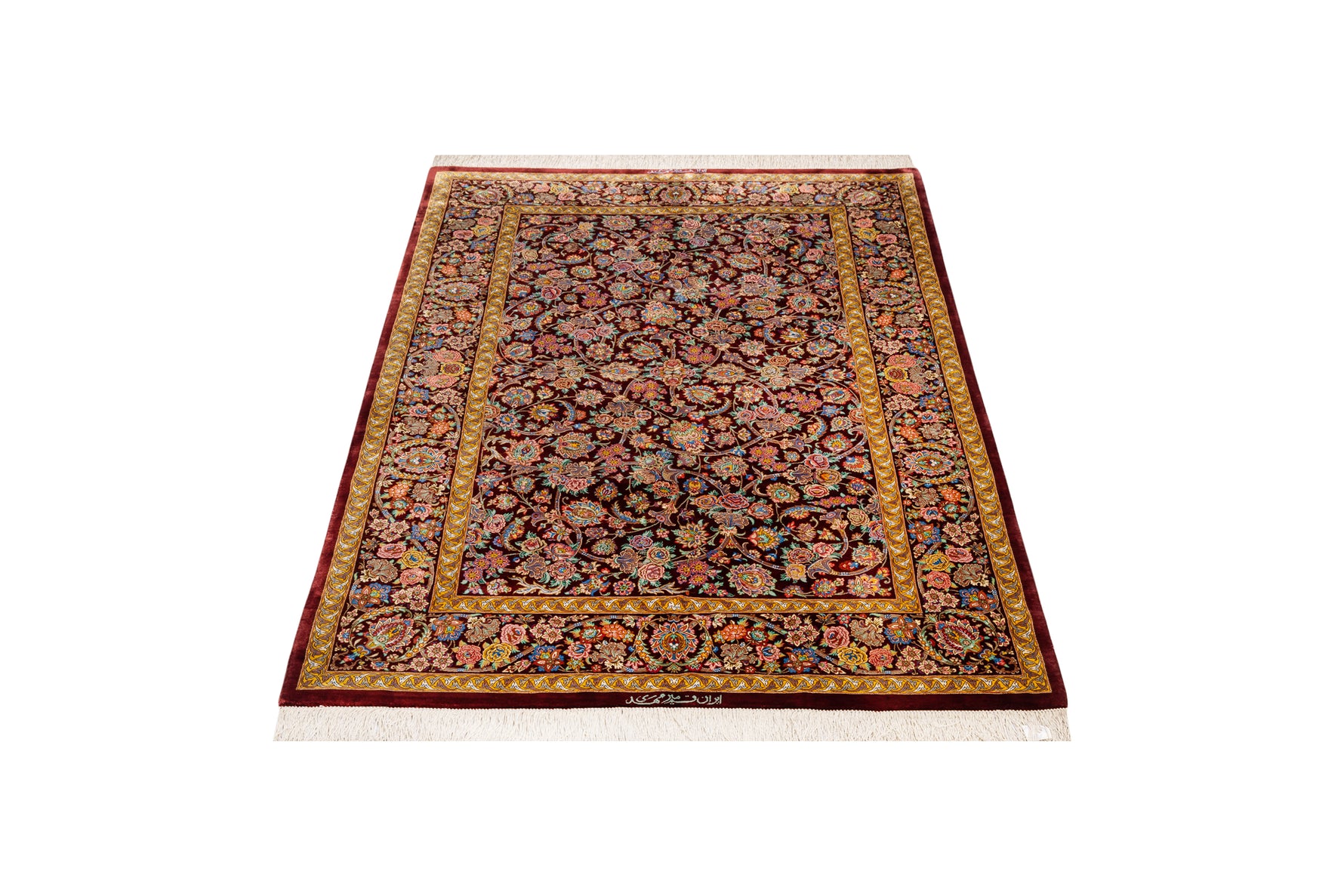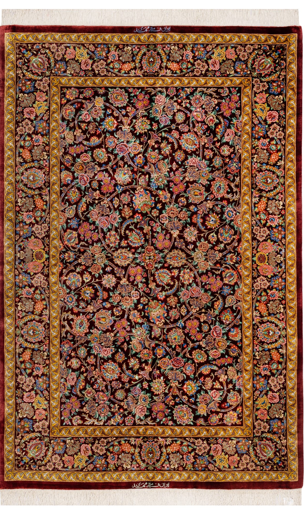 ミルメヒディ工房の作品として、ダークレッドを基調とした優雅で格調高いデザインが特長です。深みのある赤色が絨毯全体の雰囲気を引き締め、華やかでありながら落ち着きのある印象を与えます。絨毯の中心には繊細な花柄が丁寧に織り込まれ、まるで一幅の絵画のような美しさを持っています。