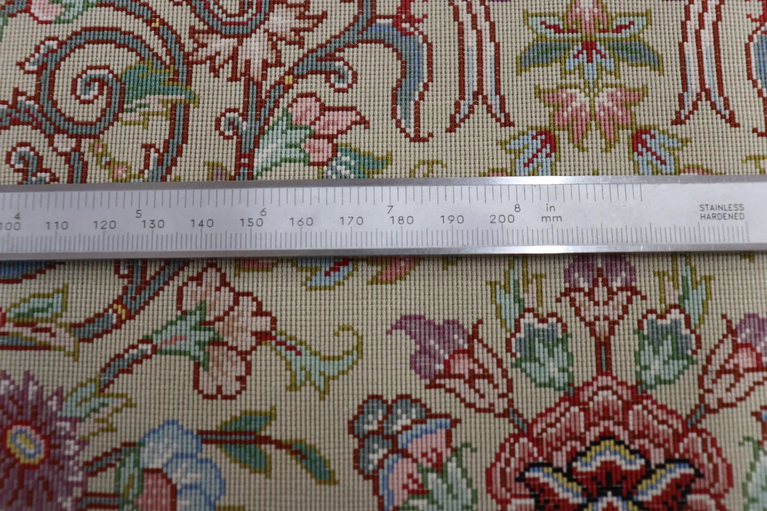 ペルシャ絨毯の真価は、実は裏側裏側からこそわかる!最高級のペルシャ絨毯は、1cmあたり10ノット(織り目)の精緻な結びが施され、その細やかさが芸術の域に達しています。