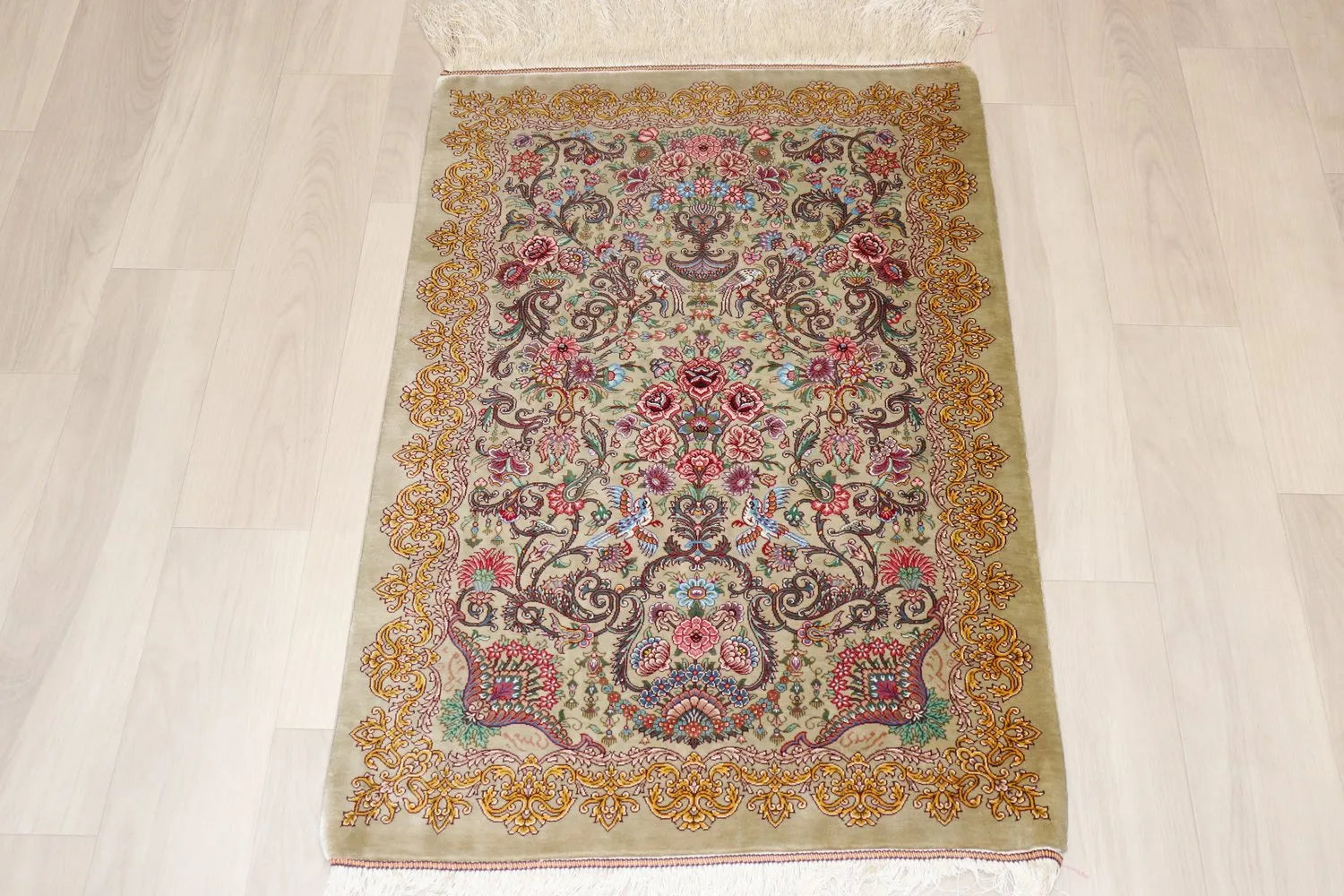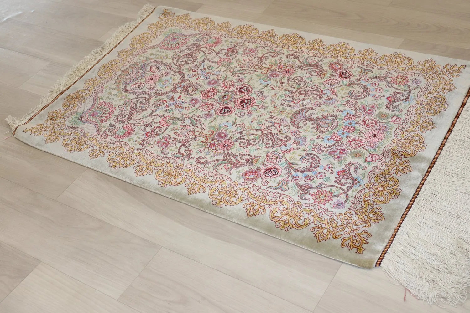 ペルシャ絨毯 クム産 シルク100% ミルメヒディ工房の細かな花模様が丁寧に織り込まれた、華やかなデザインの一枚です。中央の花束を囲むように広がる唐草模様は、大きめの柄が特徴です。そこに赤・ピンク・黄色の花々が彩られ、はっきりとした柄ながらも、一つ一つが綺麗に織られているのが印象的です。見る角度によってシルクならではの輝きが変化し、まるで絵画のような存在感を放つ最高級の逸品です。