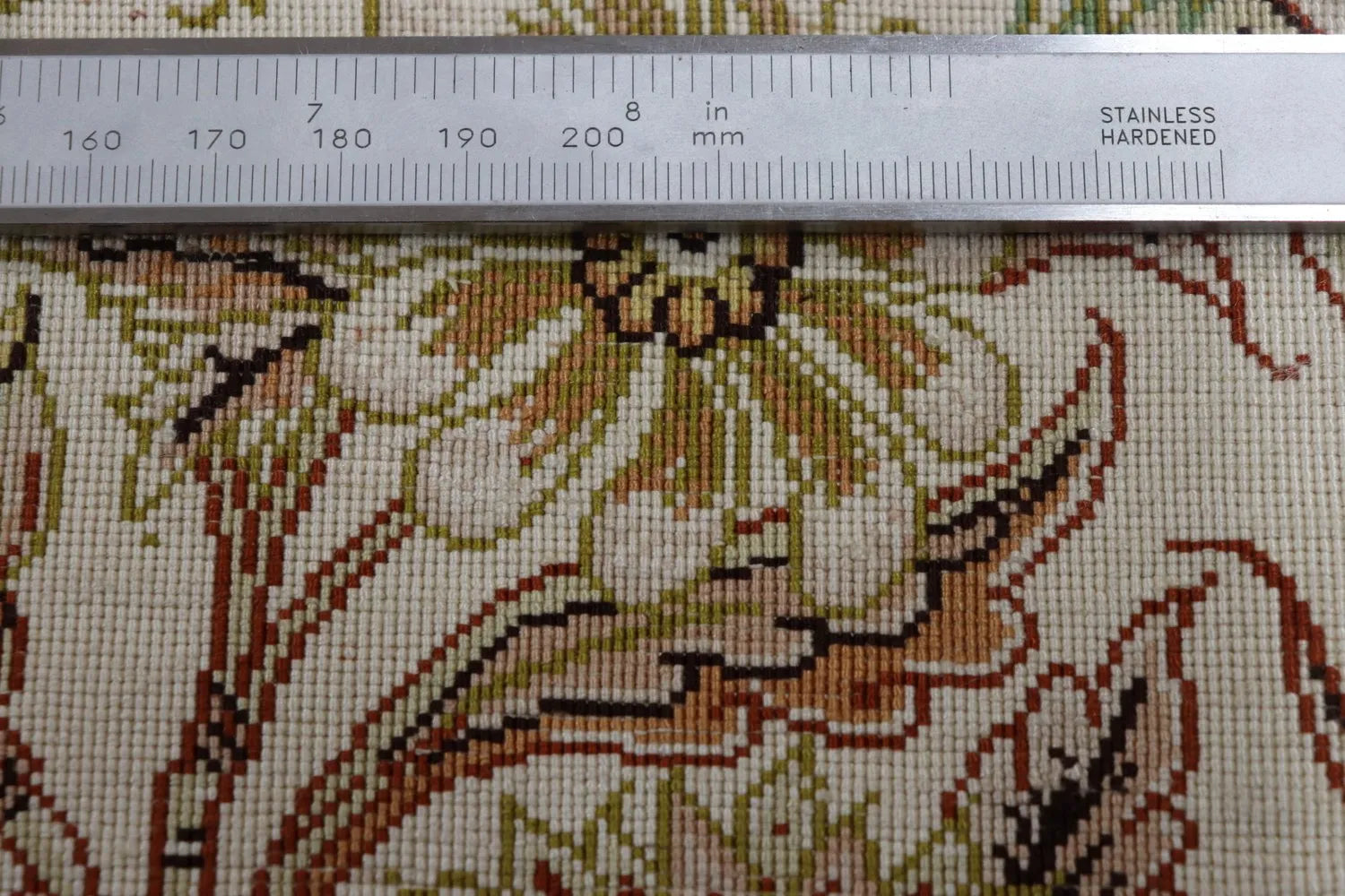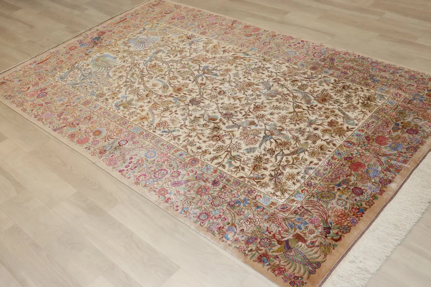 クム産ミルメヒディ工房による、シルク100%の最高級ペルシャ絨毯。やわらかなアイボリーの地に、木々を飛び交う鳥たちと繊細な草花がびっしりと描かれた楽園のようなデザインです。中央から伸びる枝は空間に奥行きを生み出し、色彩豊かな花や羽根の一本一本に至るまで緻密に織り込まれた技術の高さが際立ちます。外枠は濃いベージュでまとめられ、華やかさと上品さを両立。シルクの滑らかな光沢が光を反射し、見るたびに表情を変えます。芸術性と存在感に満ちた、特別な一枚です。