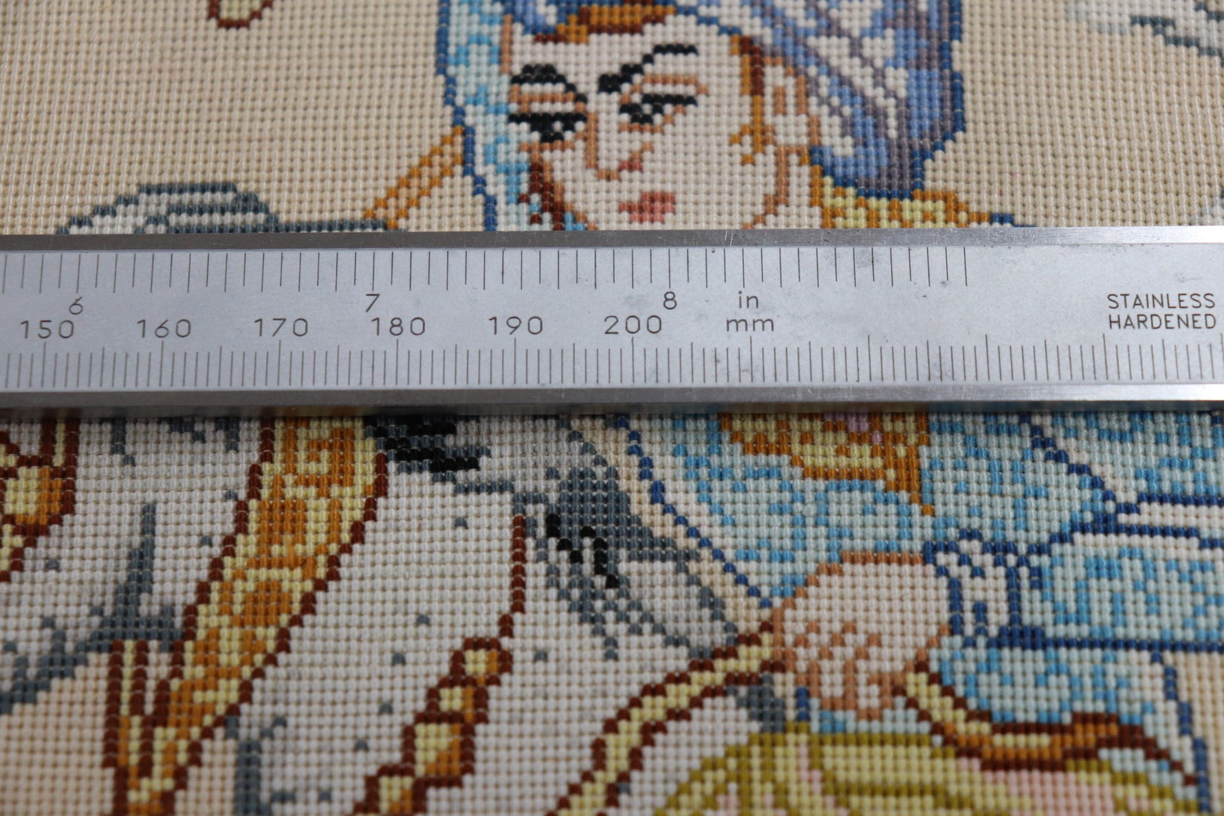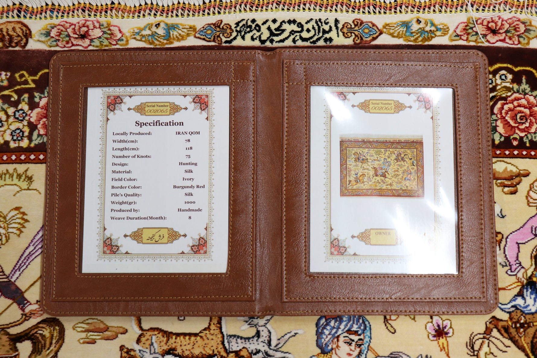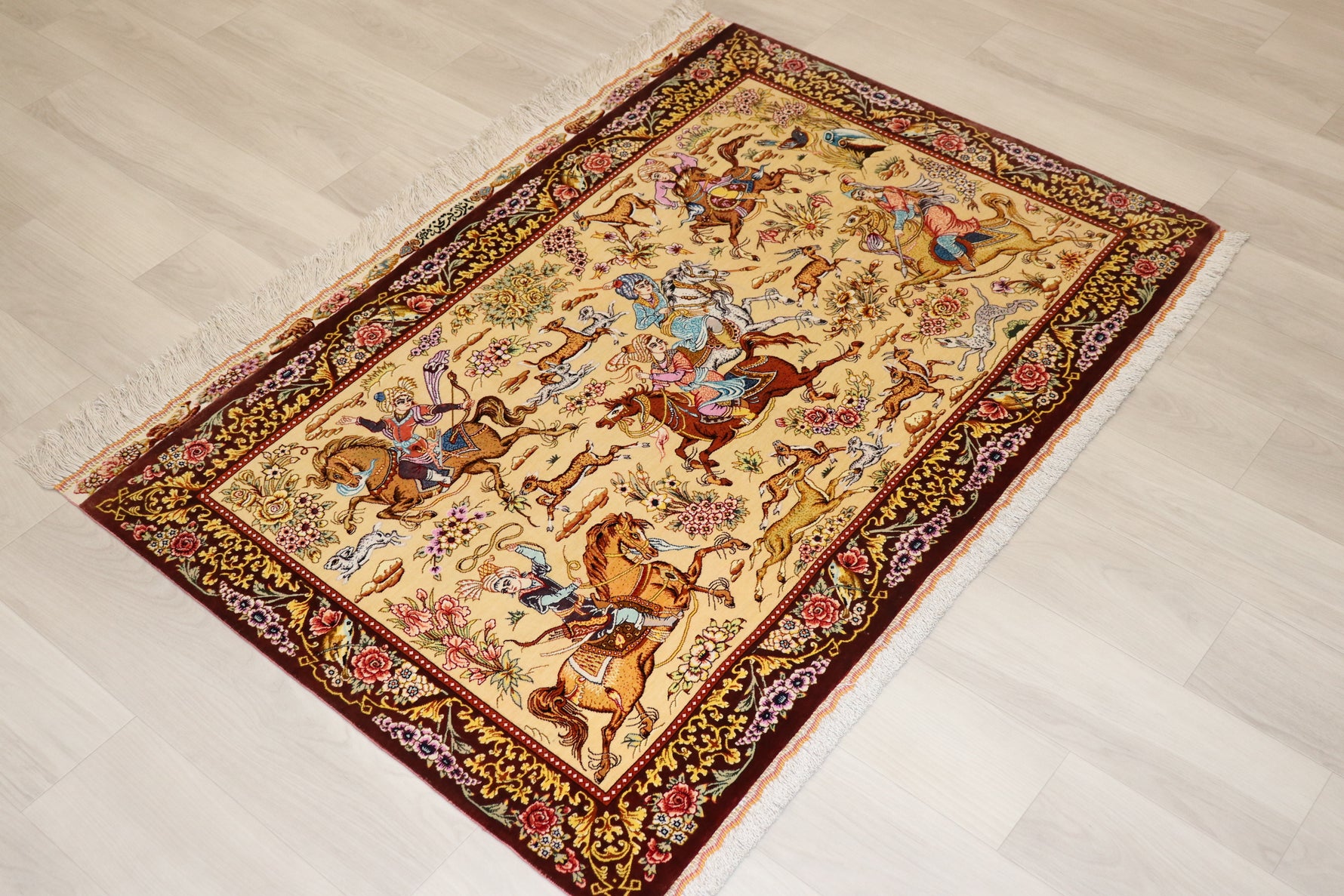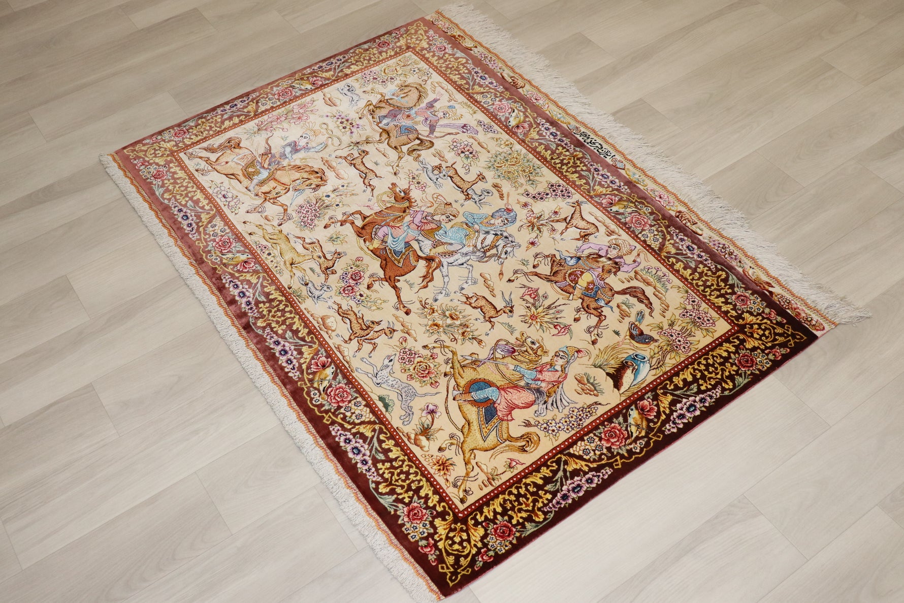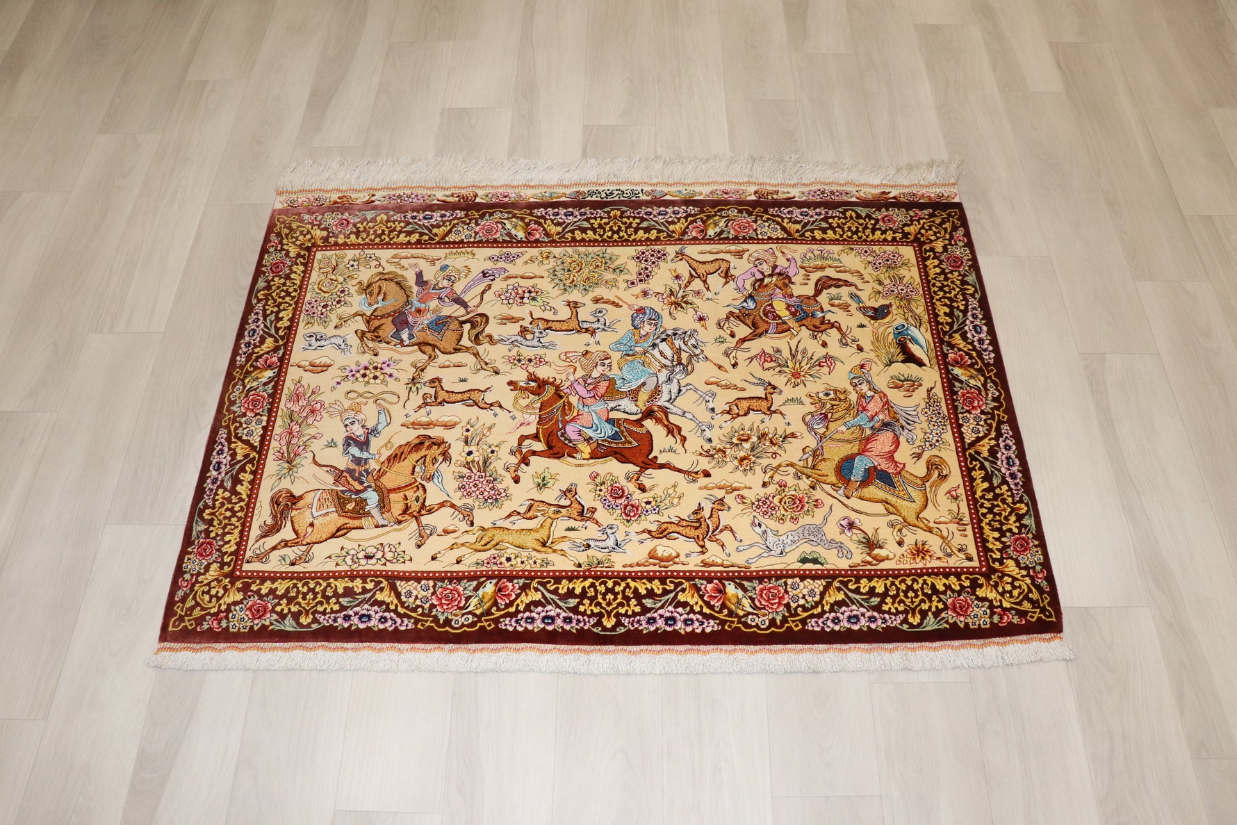 ペルシャ絨毯 クム産 シルク100% [マザヘル工房] 絵画のようなハンティング柄 玄関マットサイズ 壁飾り ID23004