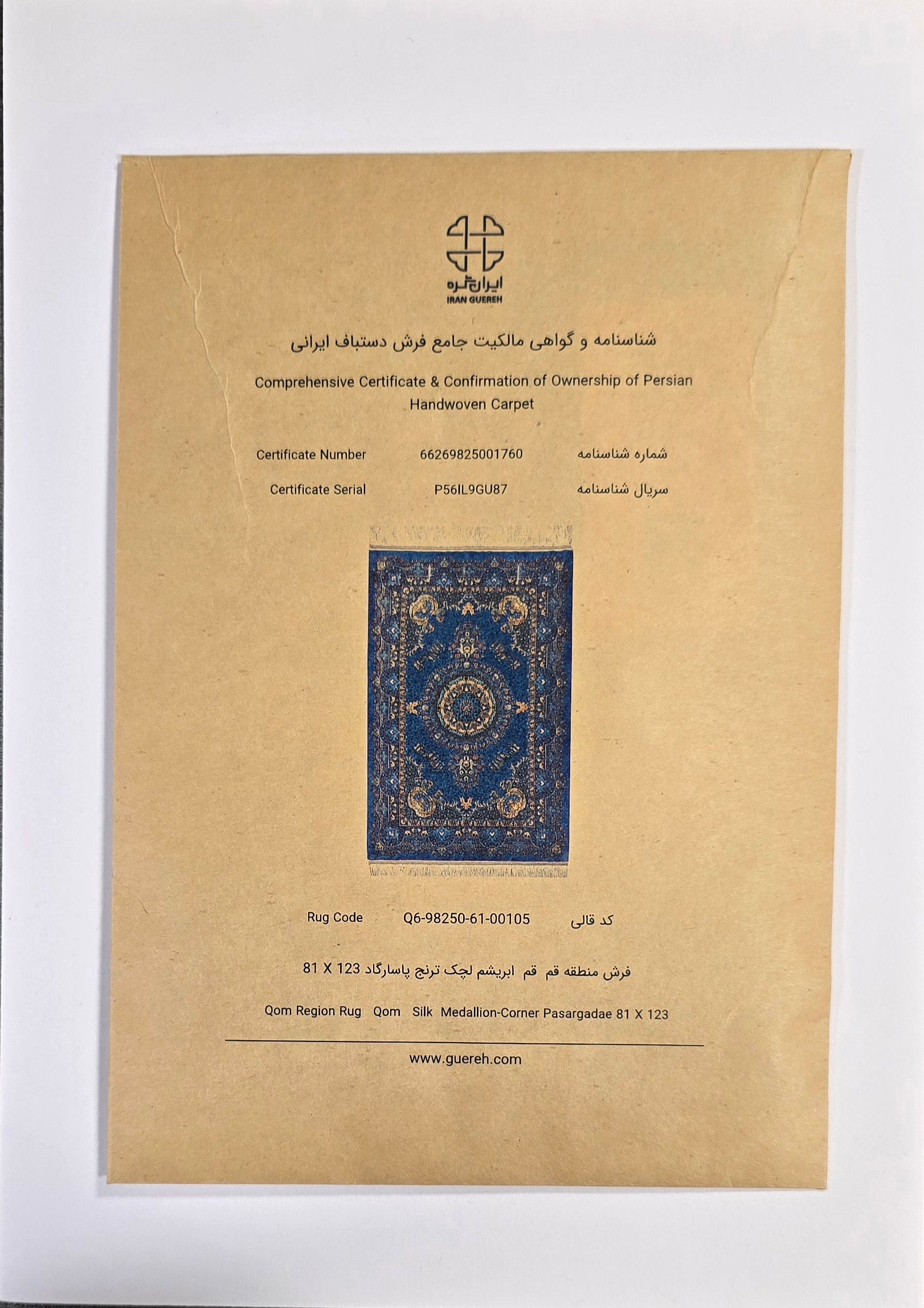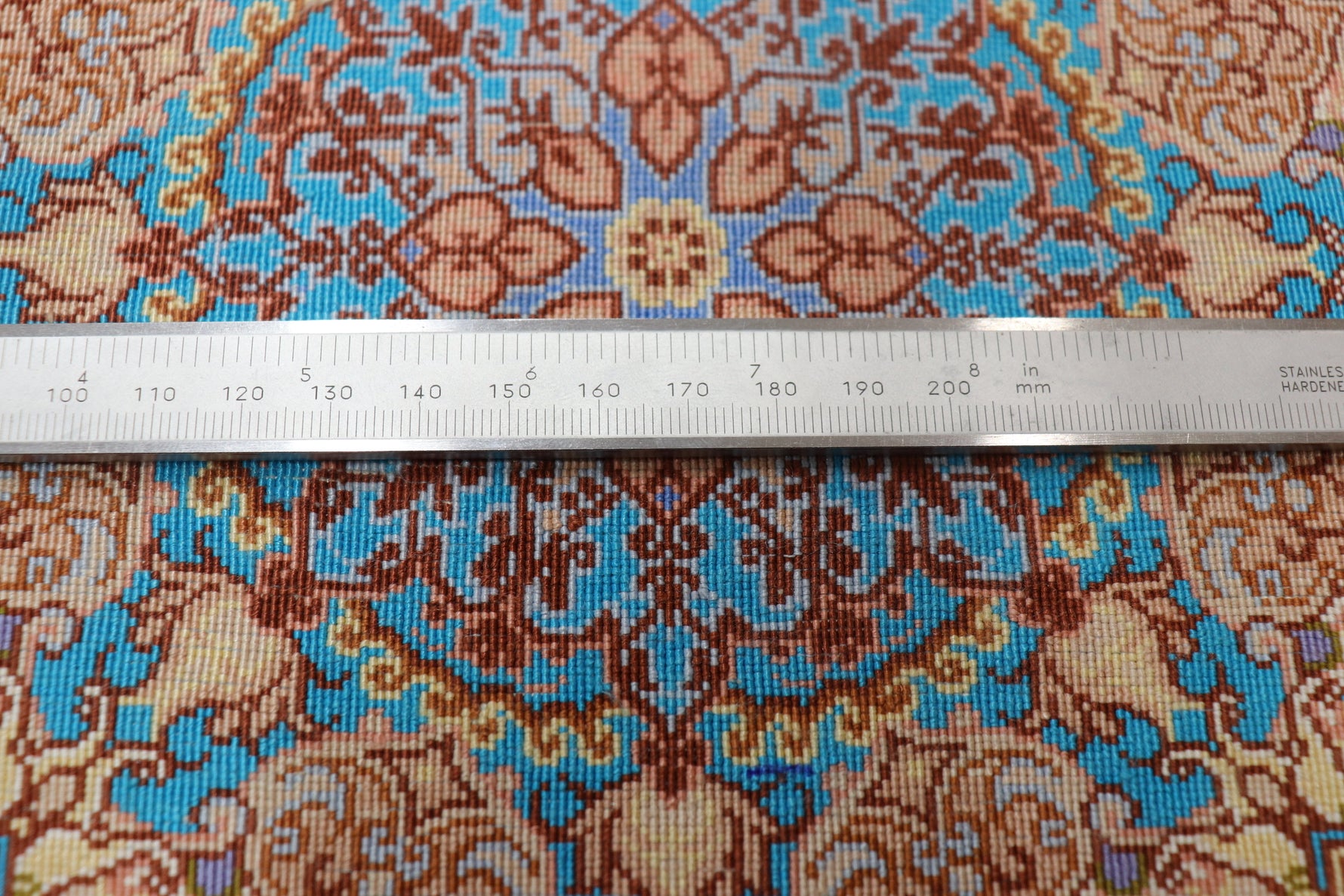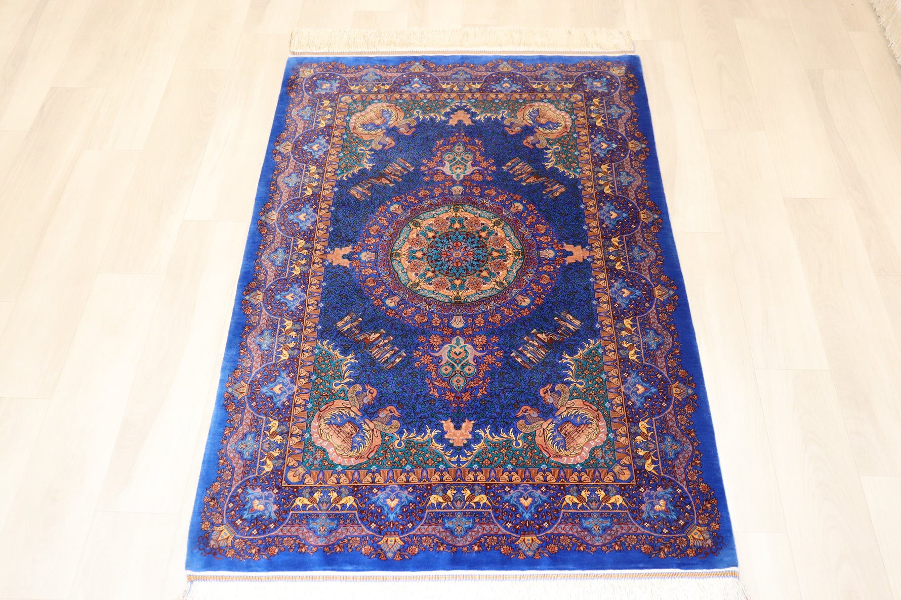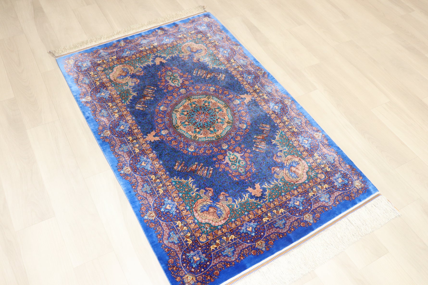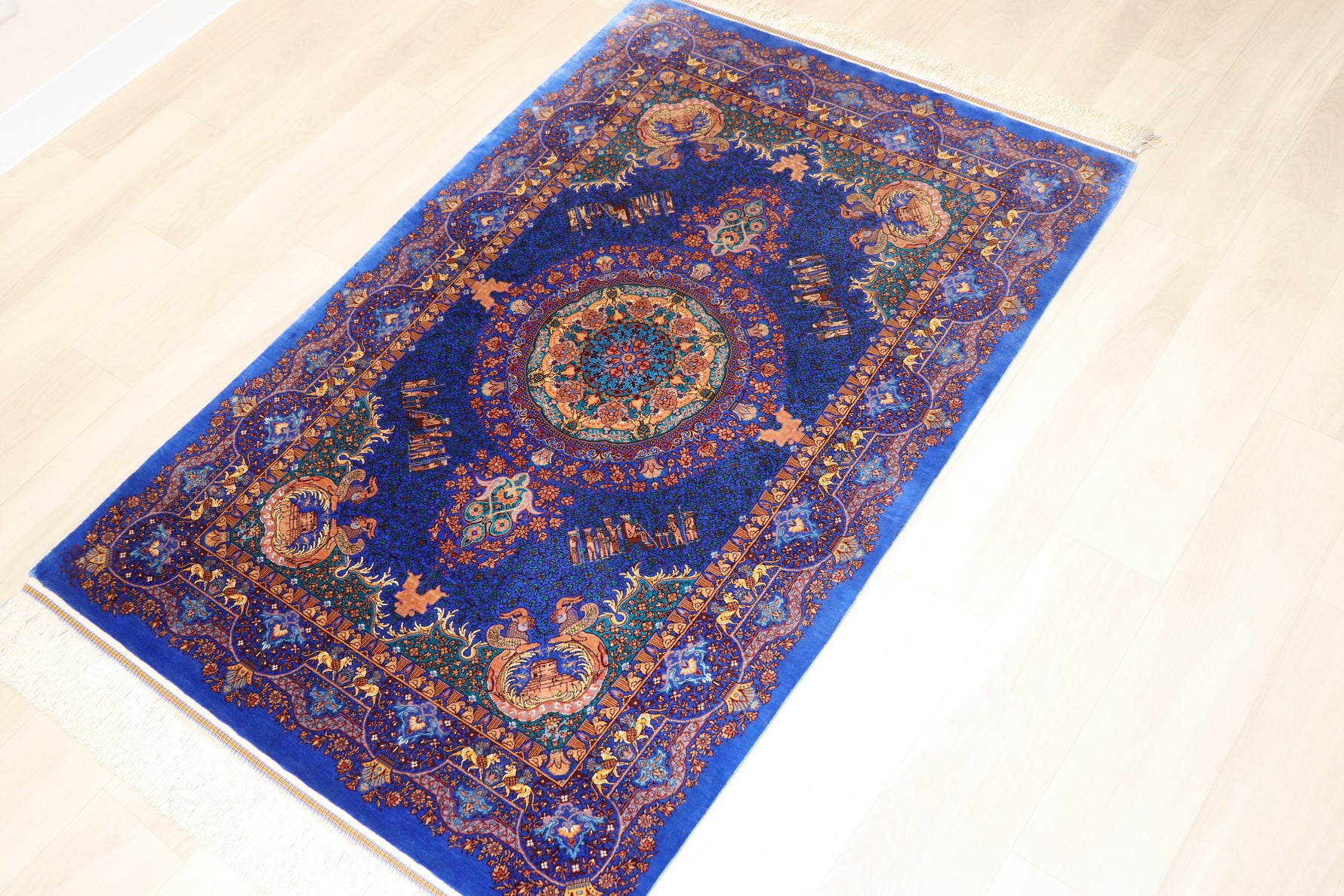鮮やかなロイヤルブルーを基調に、中央のメダリオンと格式高いモチーフが織りなす芸術的なデザイン。本作品は、ペルシャ絨毯の伝統と革新が見事に融合した逸品です。シルク特有の光沢と緻密な職人技が空間を華やかに彩ります。