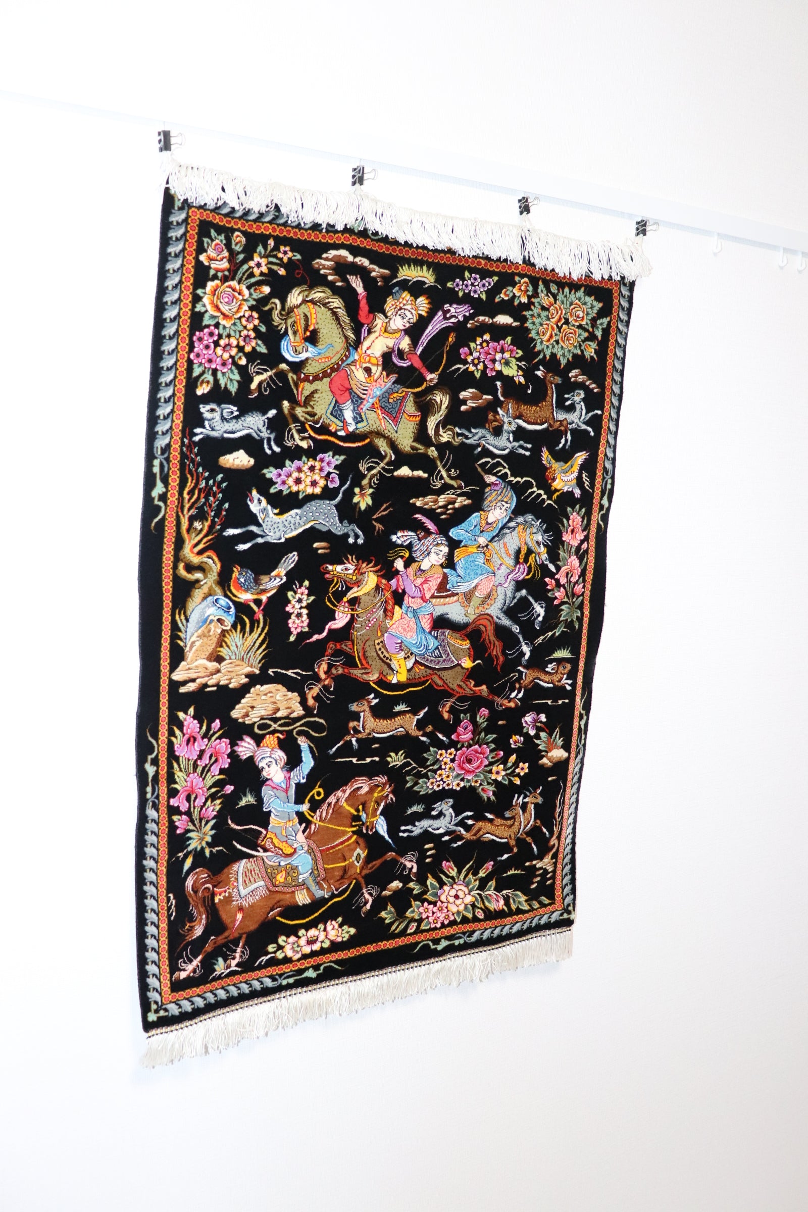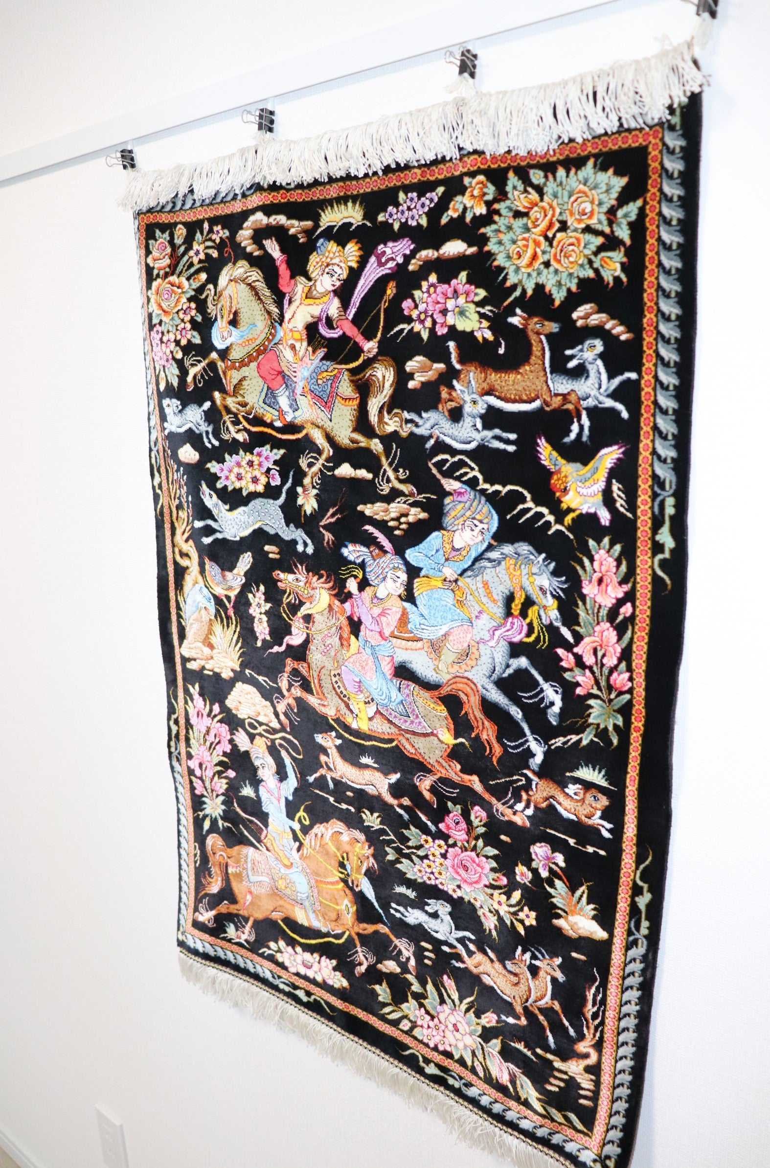 この絨毯は、シルク100%の素材を使用しており、薄さと柔らかさが特徴です。そのしなやかで繊細な質感は他を圧倒するほどの完成度を誇ります。