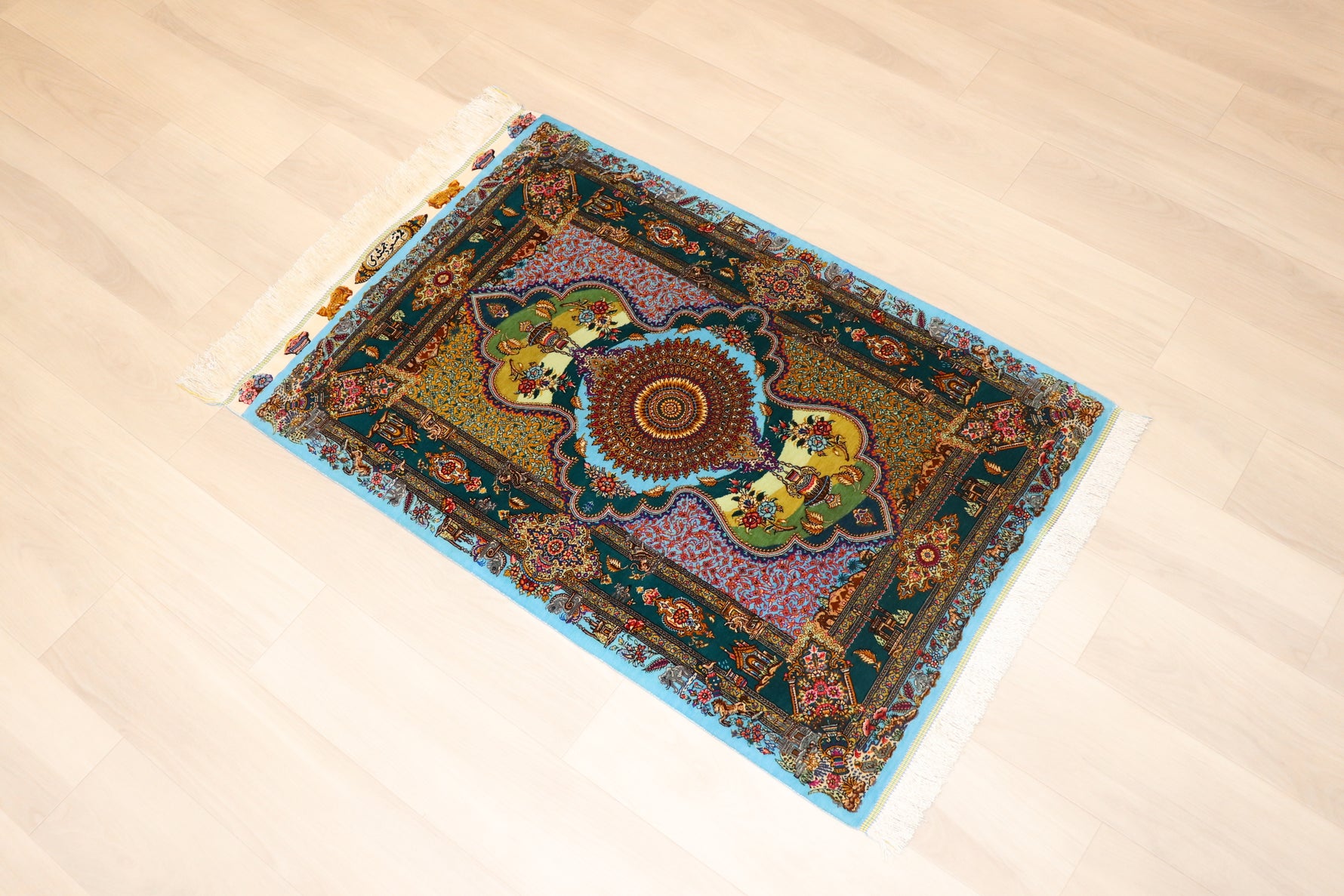 本作品は、ペルシャ絨毯の中でも特に高い芸術性と職人技術を誇るジャムシディデザインを採用した、シルク100%の逸品です。深い緑(ディープグリーン)を基調としたフィールドカラーに、中心部の華麗なメダリオンが壮麗に配置され、その周囲を囲む繊細な装飾がまるで絵画のような美しさを演出しています。縁取る鮮やかな青(ブルー)のボーダーカラーが、絨毯全体を際立たせ、明るさと調和をもたらしています。