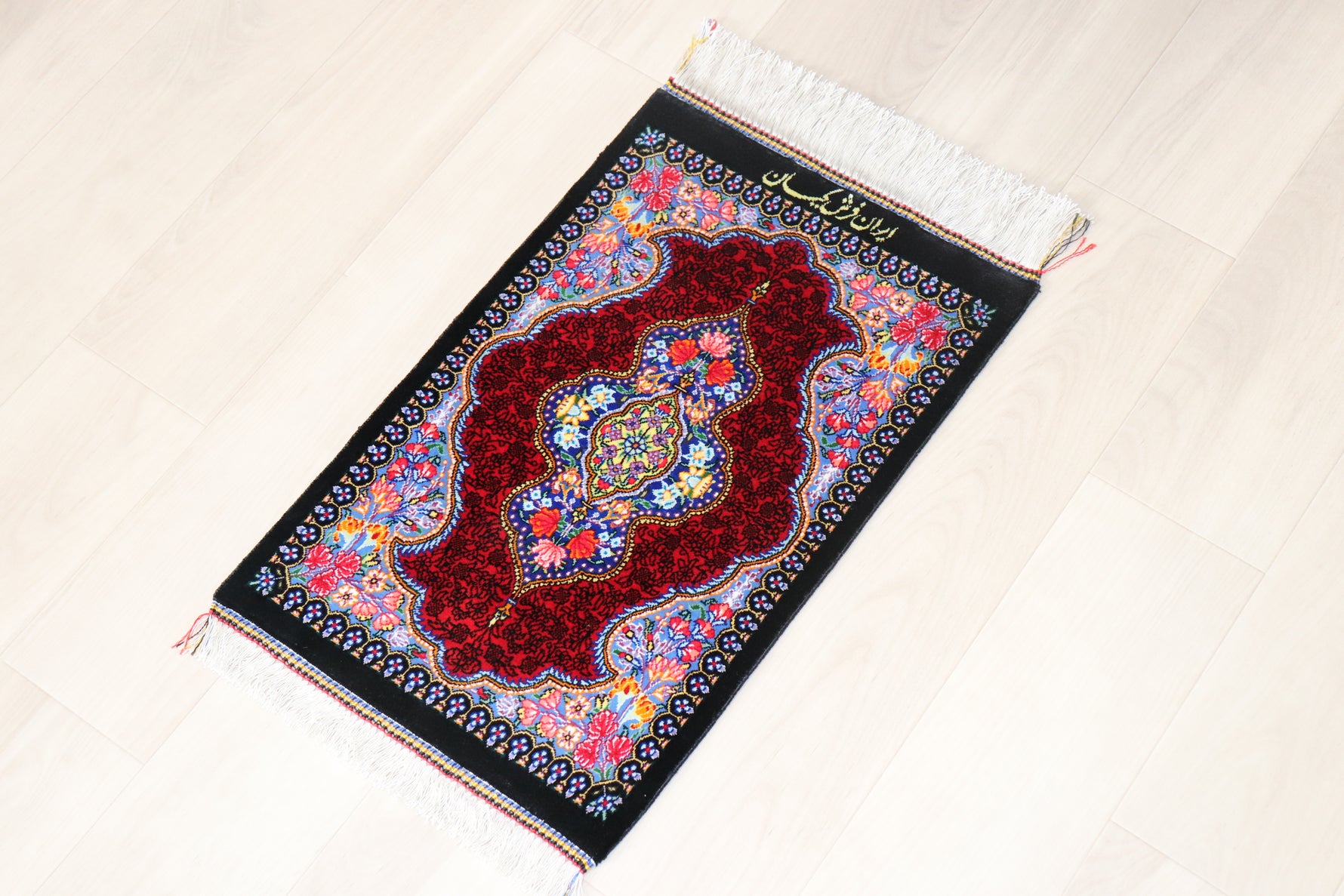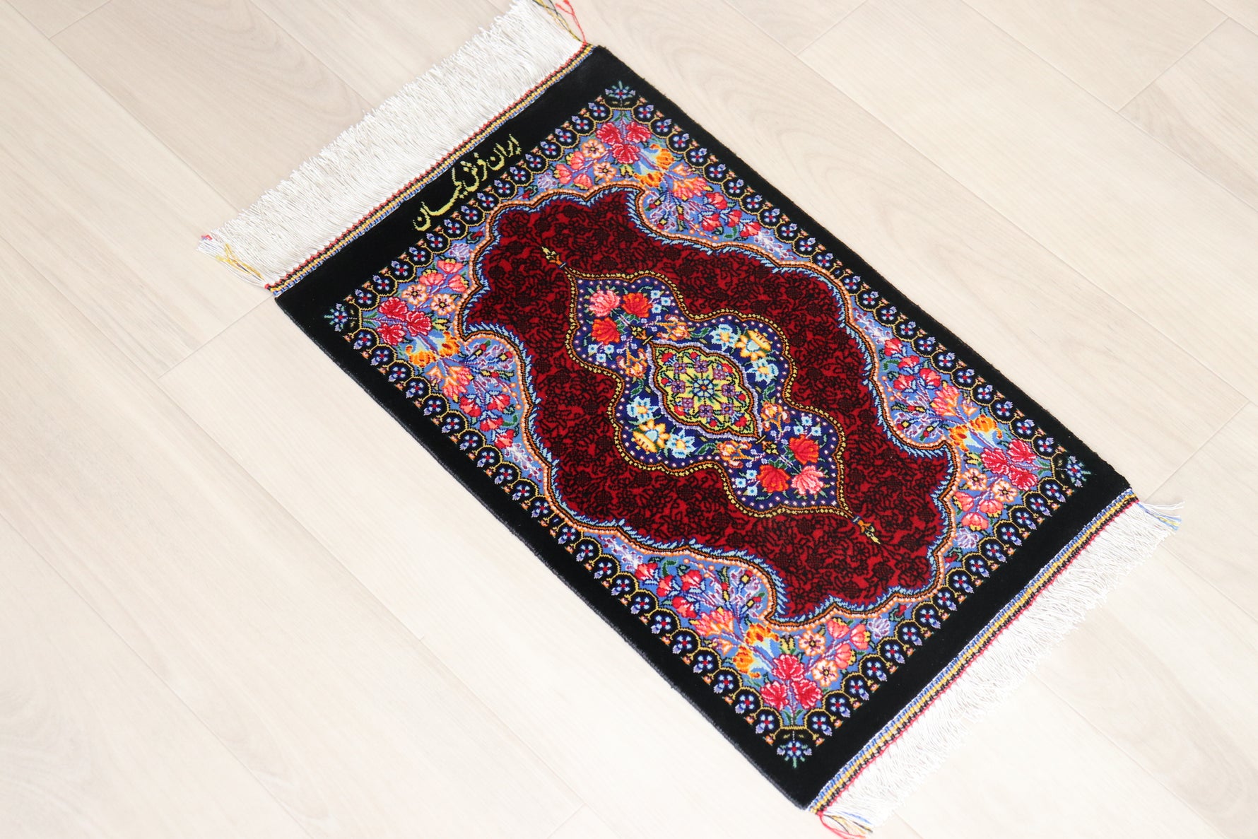 本作品は、ペルシャの伝統美と高い職人技が詰まった、シルク製高級ミニ絨毯です。