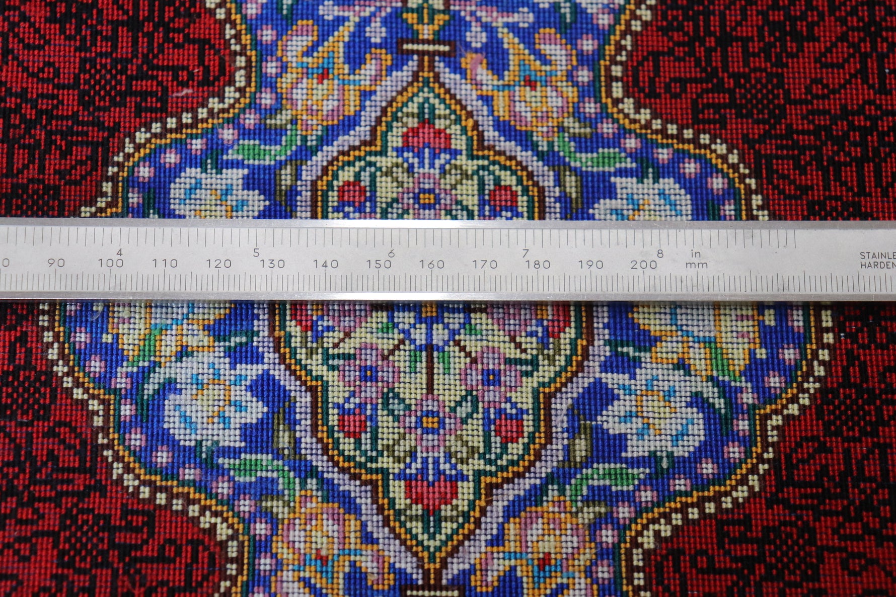 ペルシャ絨毯の真価は、実は裏側裏側からこそわかる!最高級のペルシャ絨毯は、1cmあたり10ノット(織り目)の精緻な結びが施され、その細やかさが芸術の域に達しています。