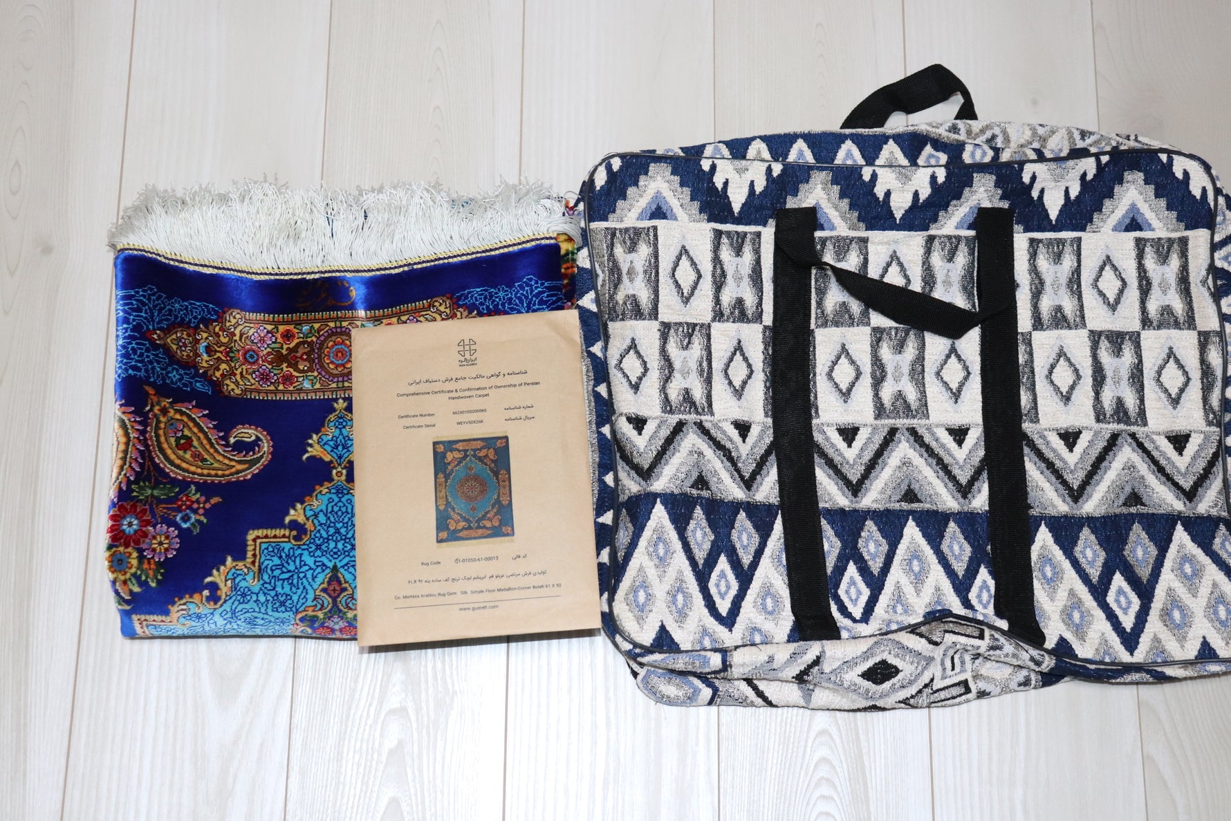 『アルバル工房』の手織りシルクペルシャ絨毯は、精緻な技術で作られた芸術作品であり、玄関マットとして最適なサイズ(92 cm x 61 cm)です。フィールドカラーには鮮やかなスカイブルーを使用し、その美しい光沢と深みのある色合いが空間を華やかに演出します。ボーダーカラーもブルーで統一され、全体のデザインに調和をもたらしています。