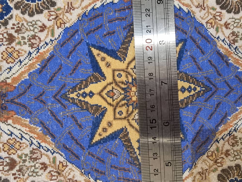 中央には深い青のフィールドが広がり、その中に配置されたメダリオンは、八角の星形をしており、その周りには精緻な模様が配置され、見る者の目を引きます。この中心的なデザインが、絨毯全体に品格を与えています。