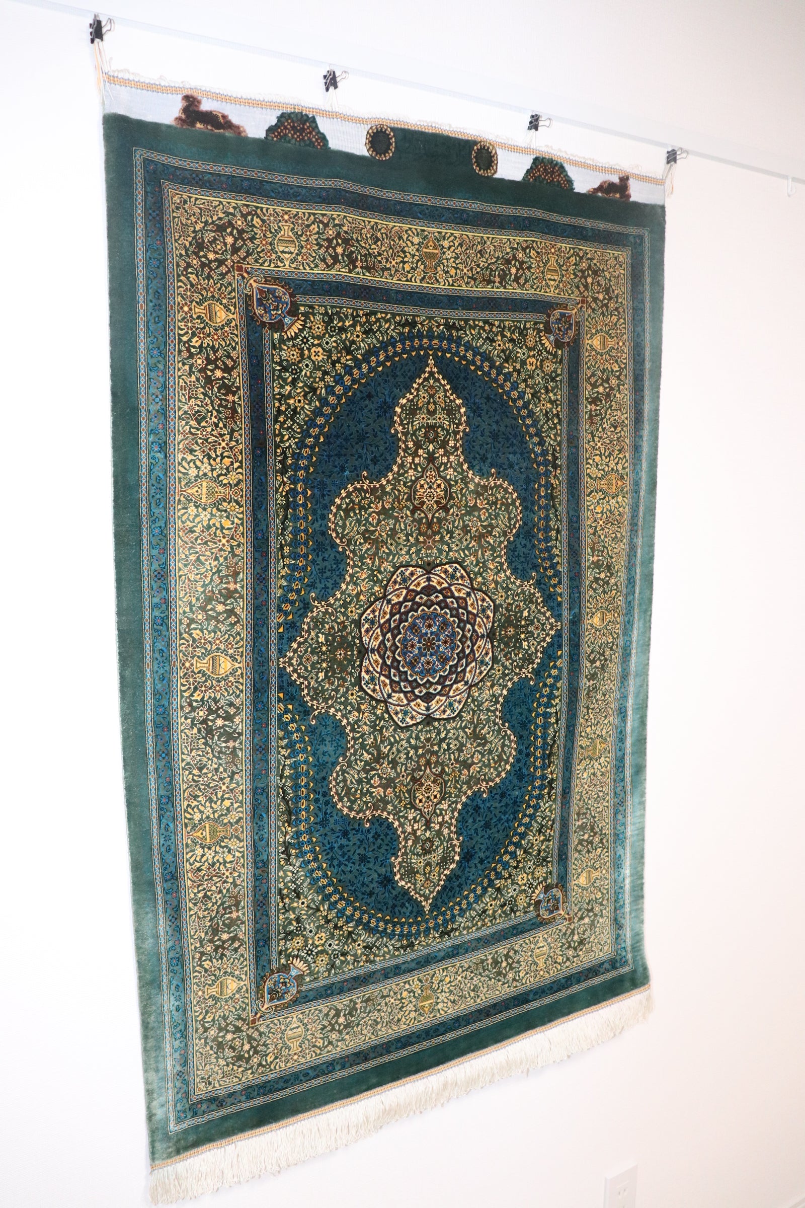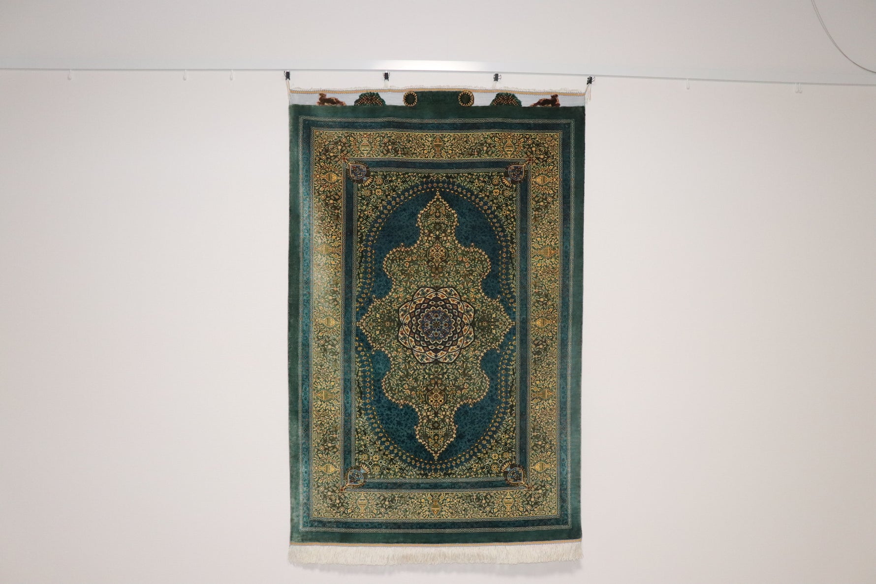 本作品は、クムのセディギヤン工房が誇る最高傑作であり、希少価値の高いシルクペルシャ絨毯です。「Persian Gulfデザイン」を採用し、深みのあるグリーンを基調とした色彩と豪華な光沢が特徴です。その美しさは一目で見る者を魅了し、まさに芸術品と呼べる逸品です。