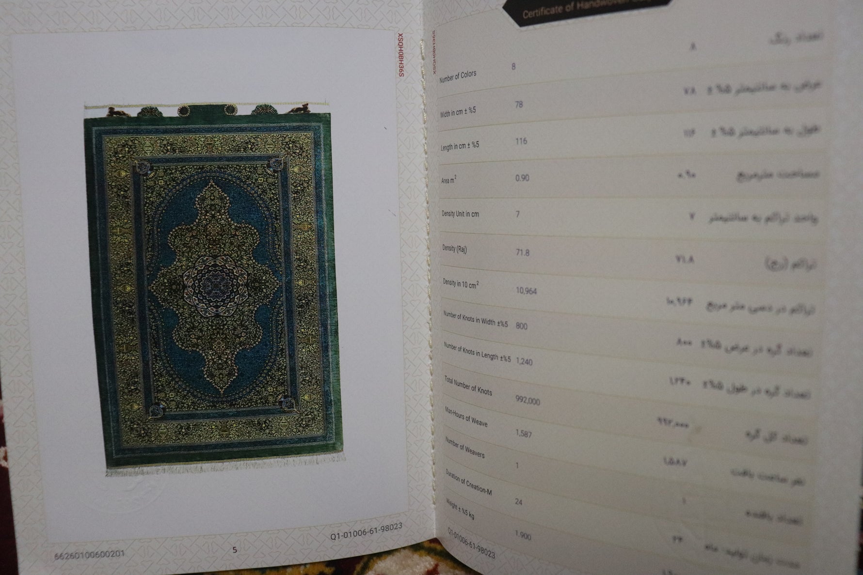 シルク100%の素材を使用し、130万ノット/平方メートルという驚異的な密度で織り上げられたこちらの絨毯は、触り心地が滑らかで、見る角度によって光沢が変化する高級感を備えています。制作には24ヶ月を要し、熟練職人の技術と時間が凝縮された価値ある作品です。