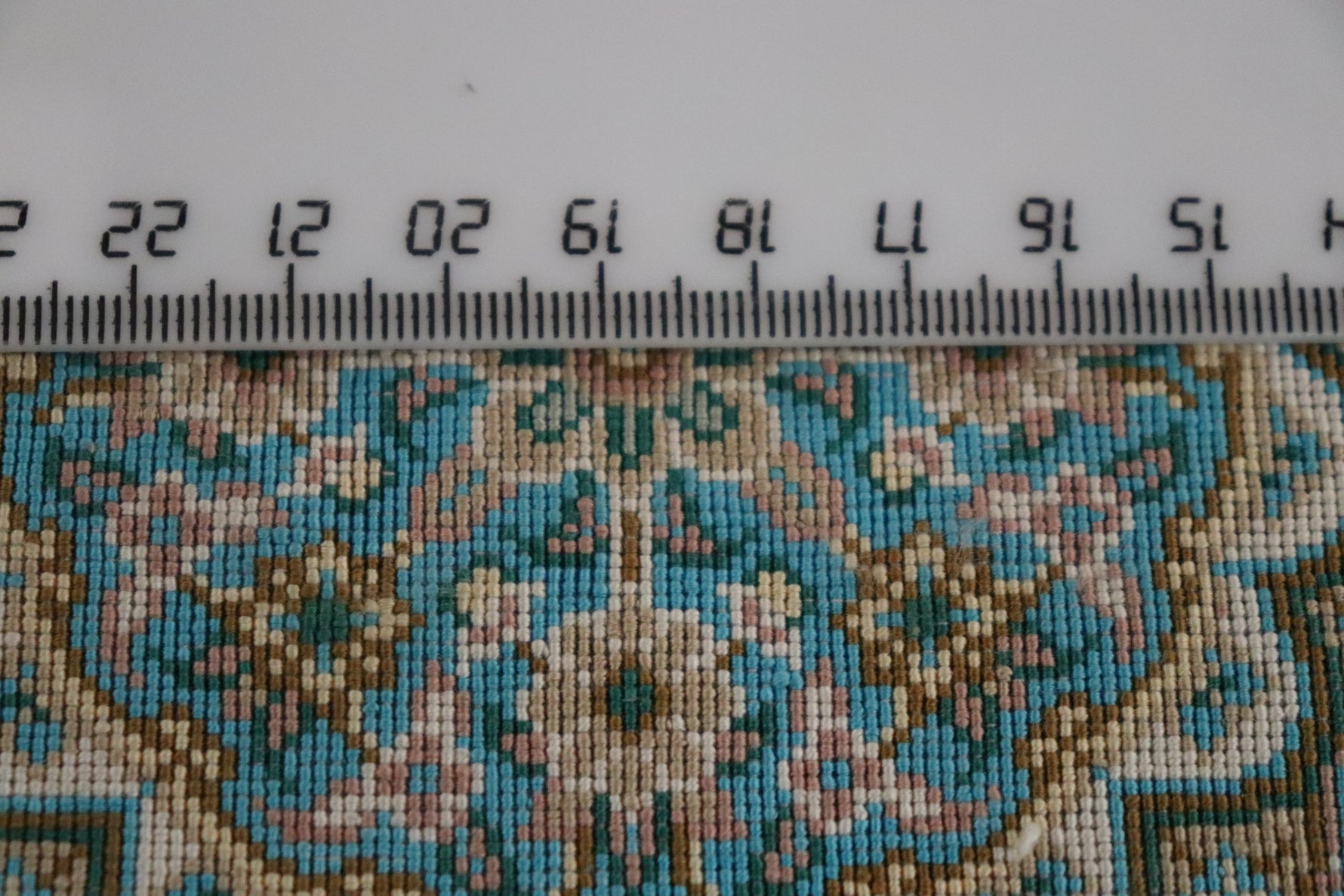 絨毯の中央にはメダリオンが配され、周囲を取り囲むラチャク・トランジ文様が調和の取れたデザインを完成させています。細密に織り込まれた花柄や伝統的なペルシャのモチーフが、空間に優雅さと格式をもたらします。